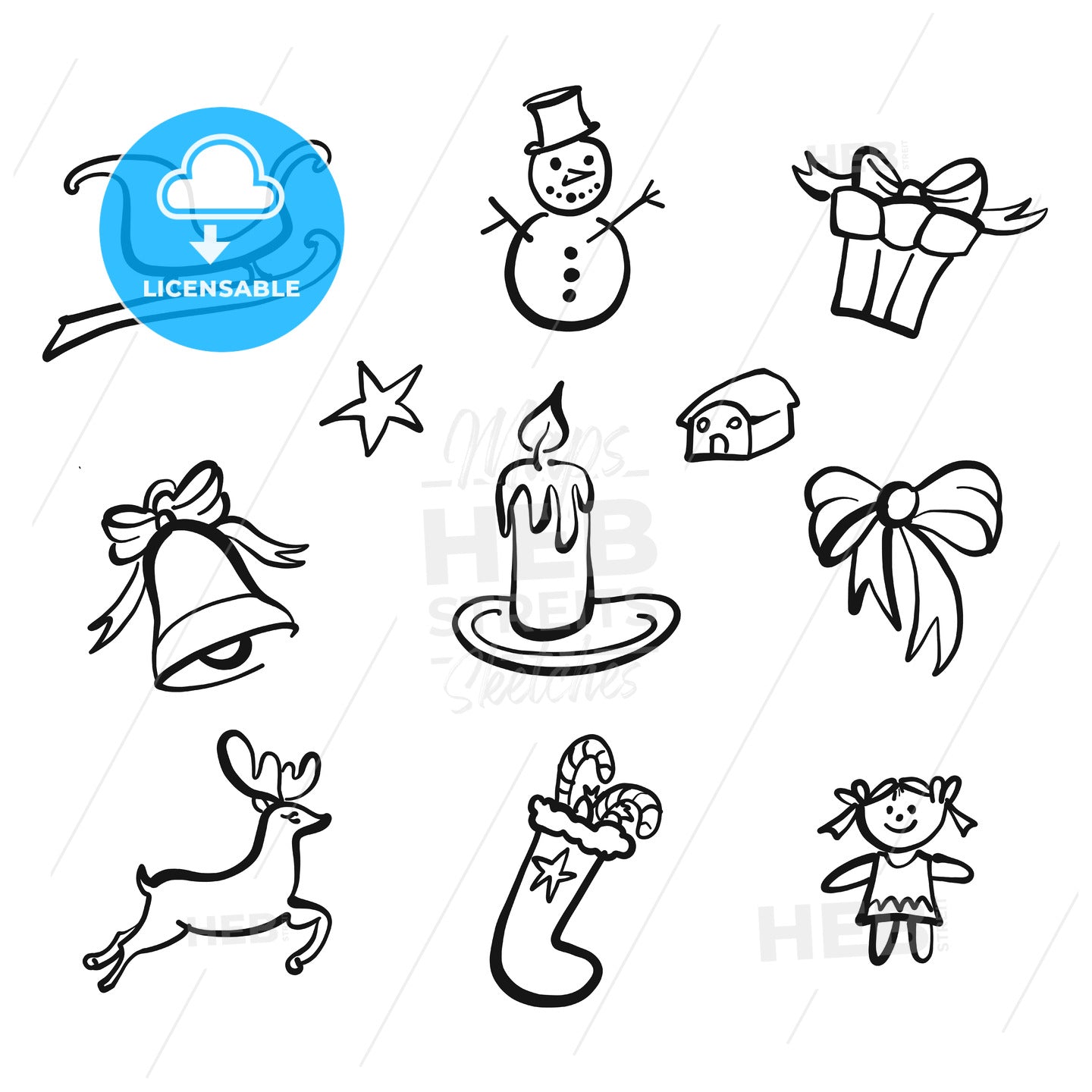 christmas icons drawings. Nice seasonal calligraphic artwork for greeting cards. Hand-drawn vector sketch.