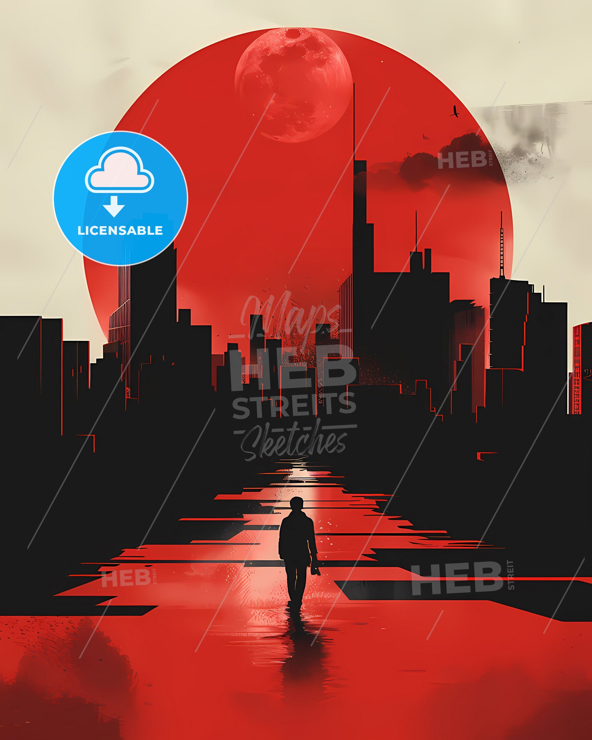 City Walk Illustration 2D Red Black Abstract Art Painting Modern Design Cityscape