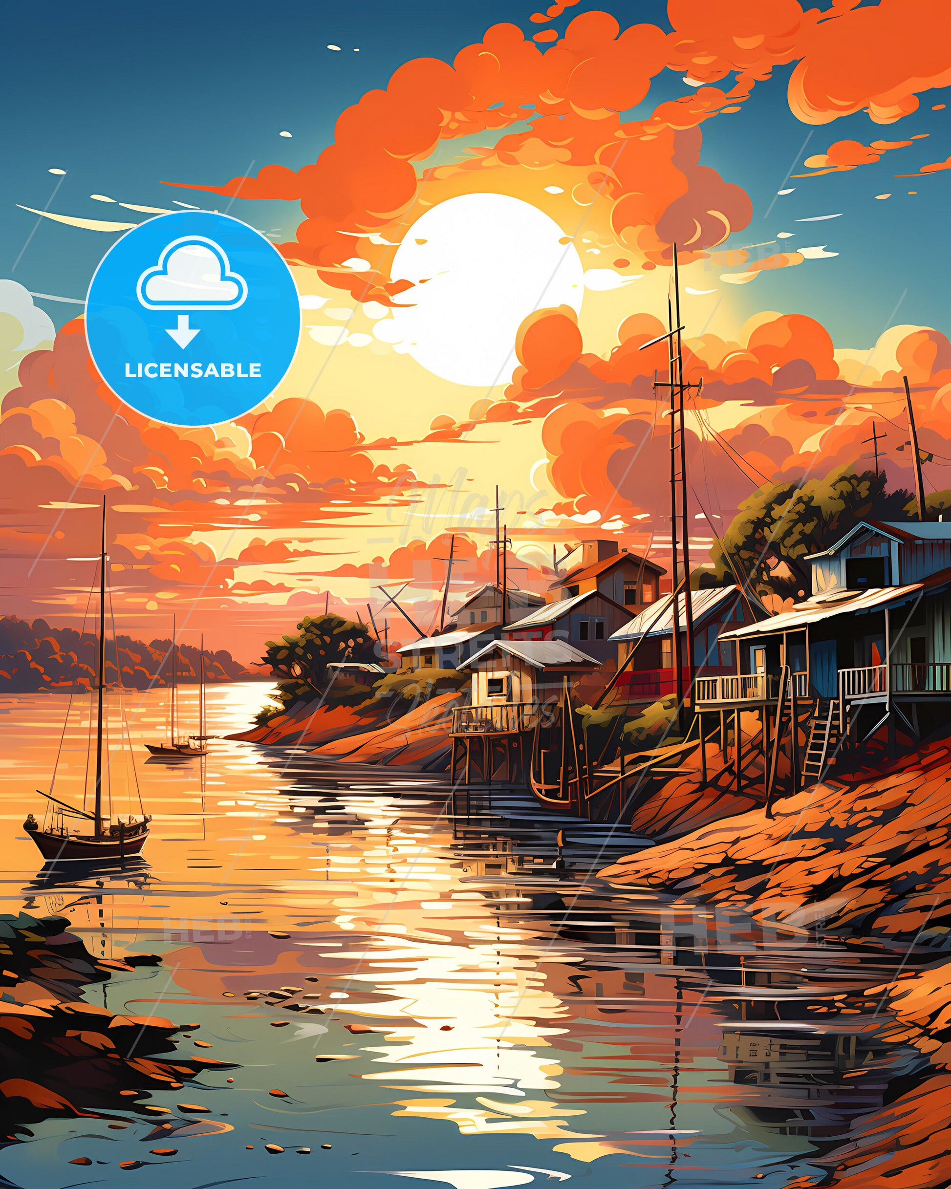 Painted Skyline of Ciudad del Este Paraguay with River, Houses, and Boats