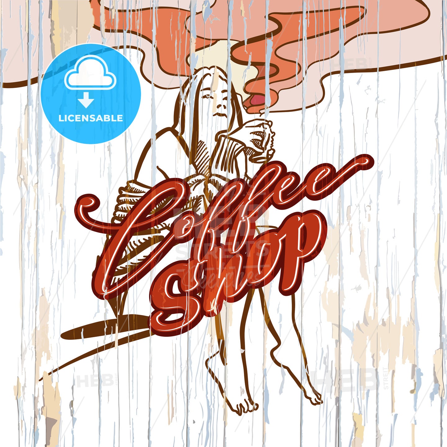 Coffee shop girl drawing on wooden background. Vector illustration drawn by hand.