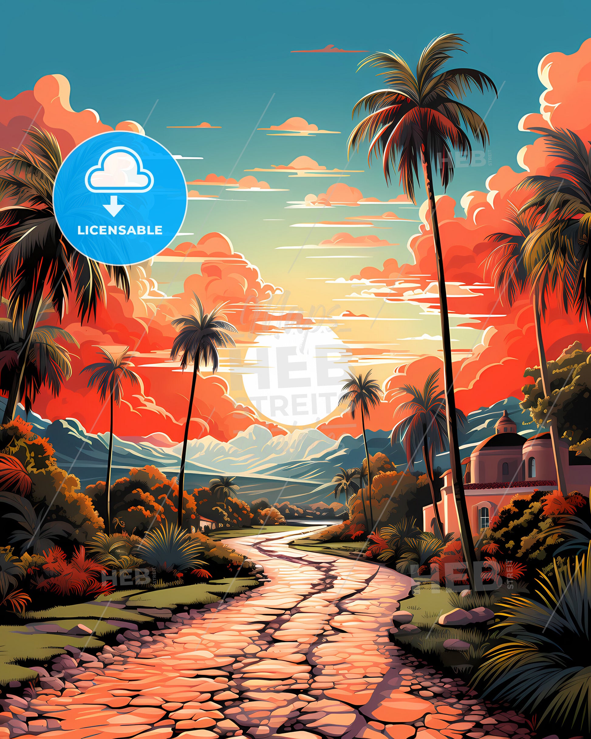 Coral Springs, Florida, Skyline. art painting with blue sky some bright clouds in spring. in style of classic advertising illustration with nice gradients. Nice strokes and outlines that captures the playful spirit and vivid imagination of modern art.