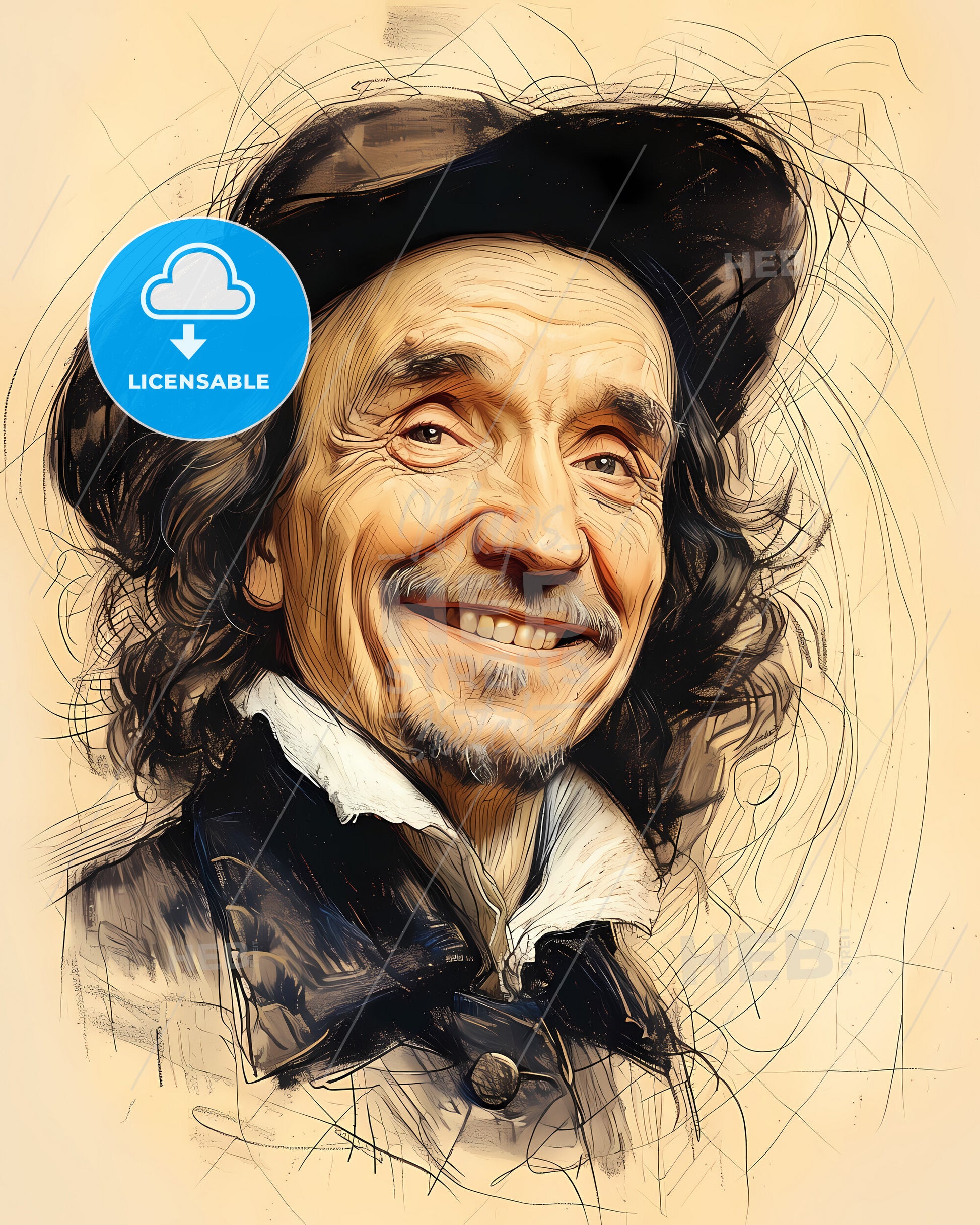 Portrait of Cornelius Jansen, 1585 - 1638, Theologian, Dutch Catholic bishop and theologian, influential in the Jansenist movement. - smiling. Vintage art illustration on bright beige paper background, sweeping overdrawn lines, subtile colored artwork, that captures the playful spirit and vivid imagination of modern art.