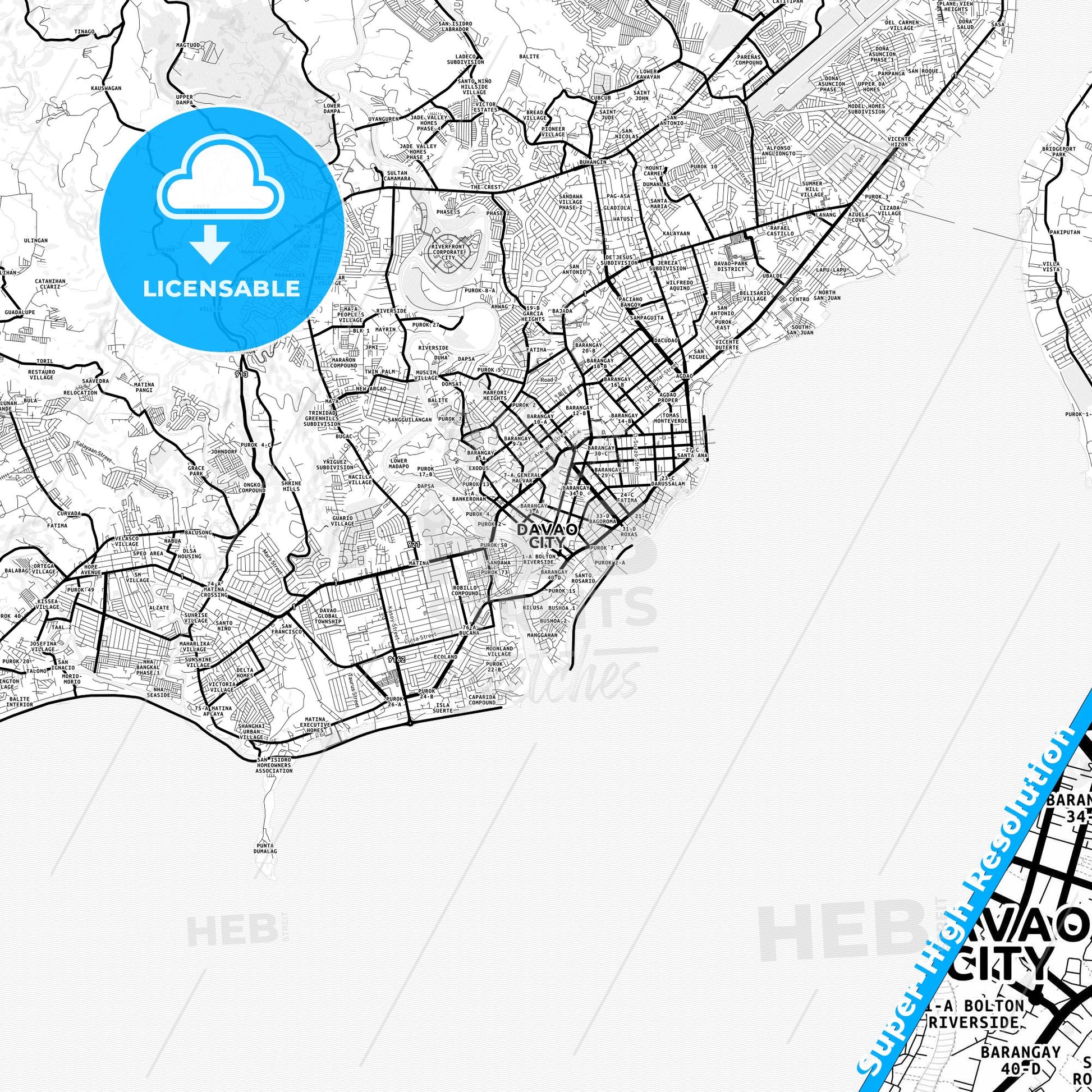 Davao City, Davao del Sur, Philippines in high-resolution, minimalist map designed for printed use. This detailed black and white map accurately highlights the street network and urban layout, making it an ideal ready-to-use map for your business.