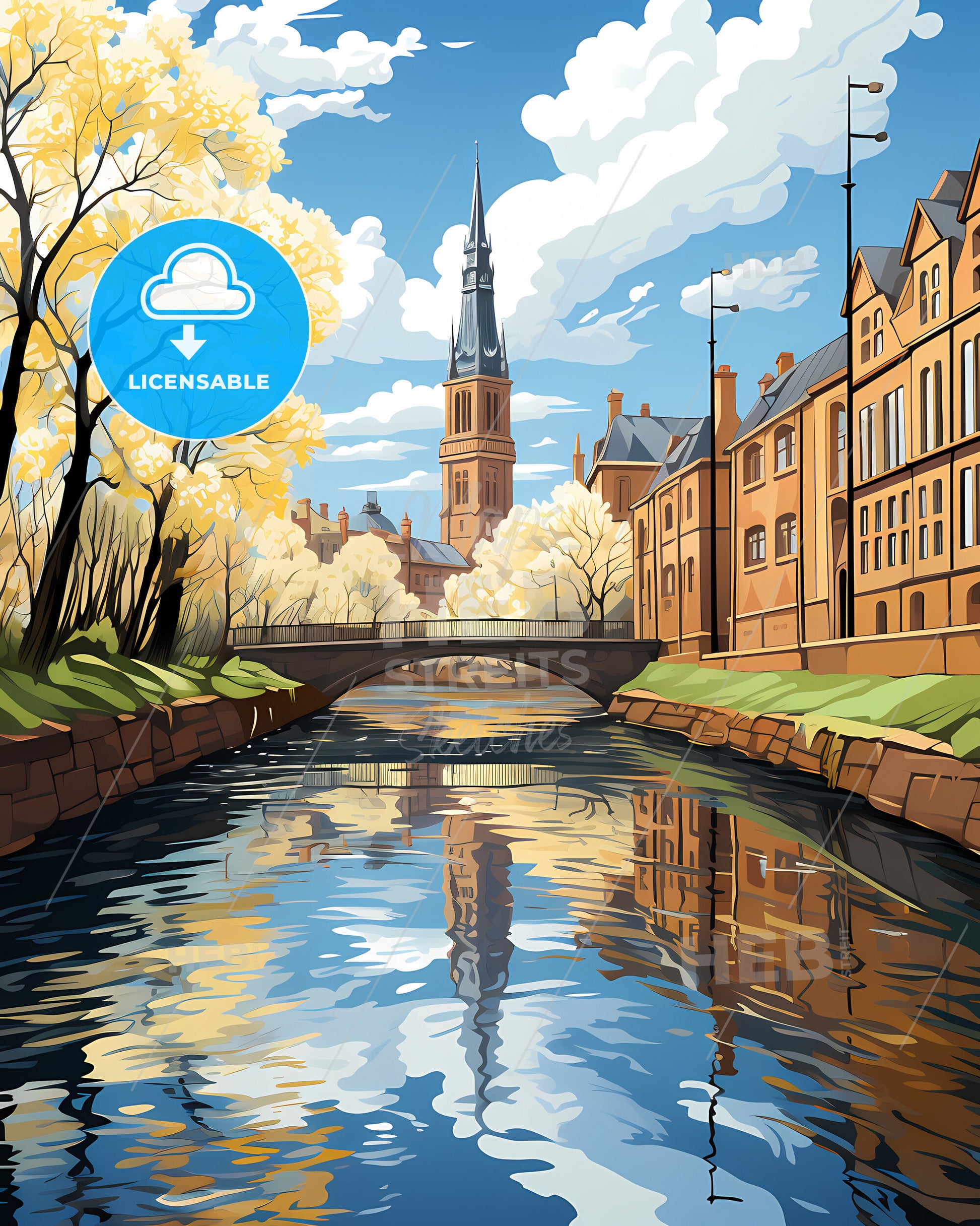 Derby, East Midlands, Skyline. art painting with blue sky some bright clouds in spring. in style of classic advertising illustration with nice gradients. Nice strokes and outlines that captures the playful spirit and vivid imagination of modern art.