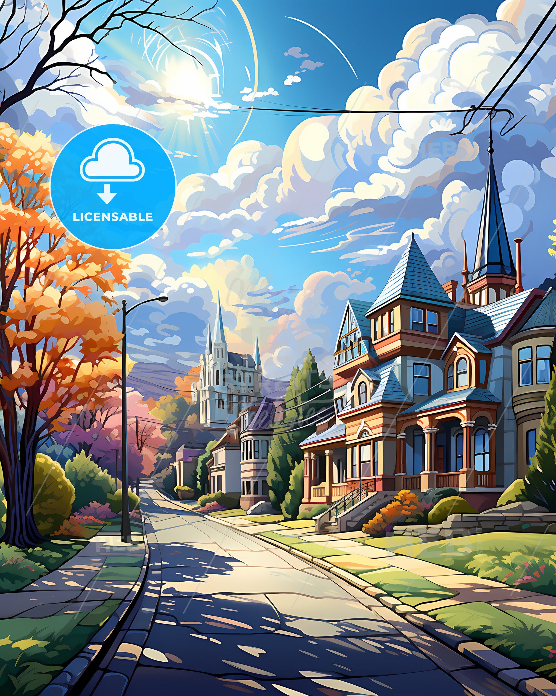 Donetsk, Donetsk Oblast, Ukraine, Skyline. art painting with blue sky some bright clouds in spring. in style of classic advertising illustration with nice gradients. Nice strokes and outlines that captures the playful spirit and vivid imagination of modern art.