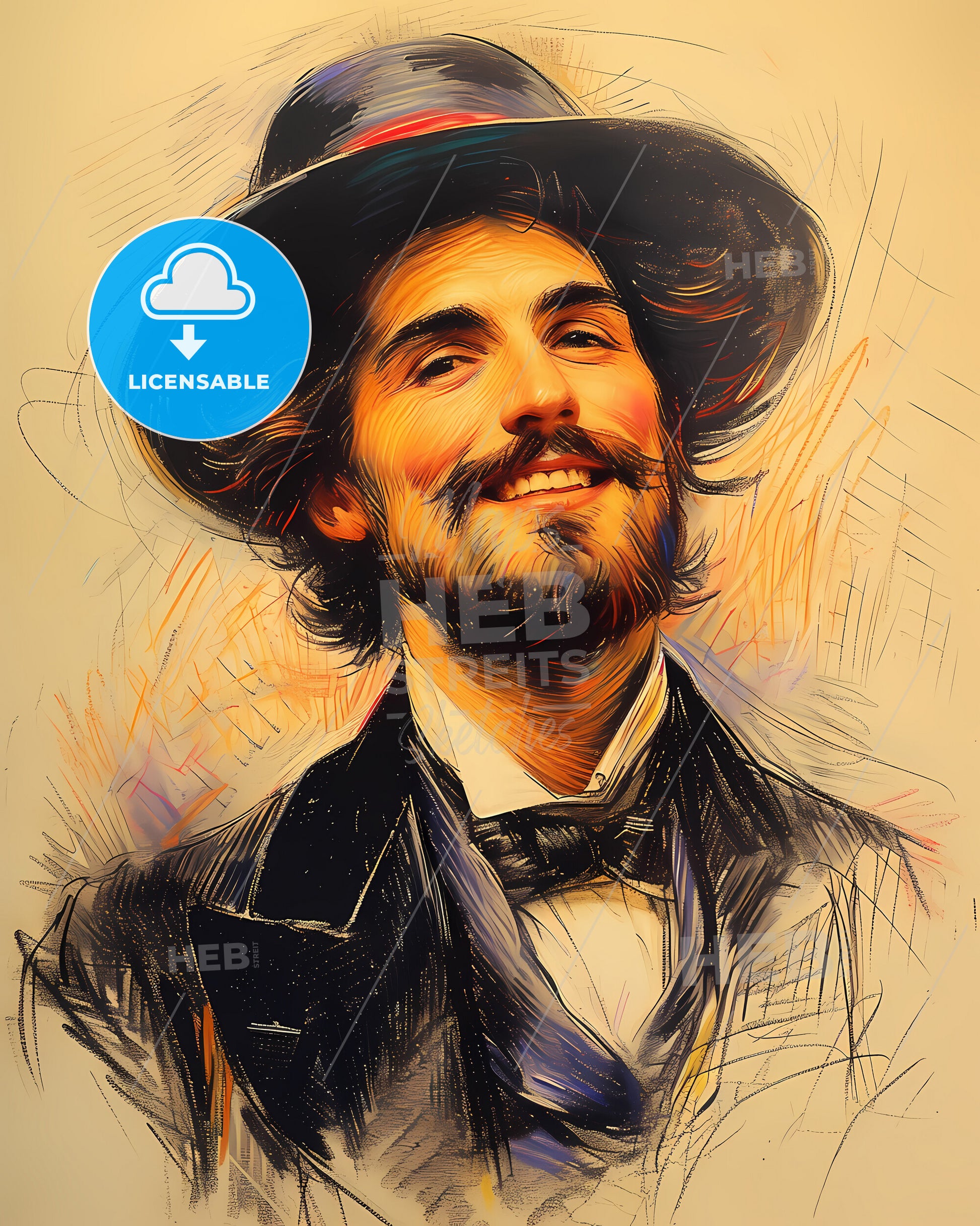 Portrait of Édouard Manet, 1832 - 1883, Artist, Forefather of Impressionism smiling. Vintage art illustration on bright beige paper background, sweeping overdrawn lines, subtile colored artwork, that captures the playful spirit and vivid imagination of modern art.