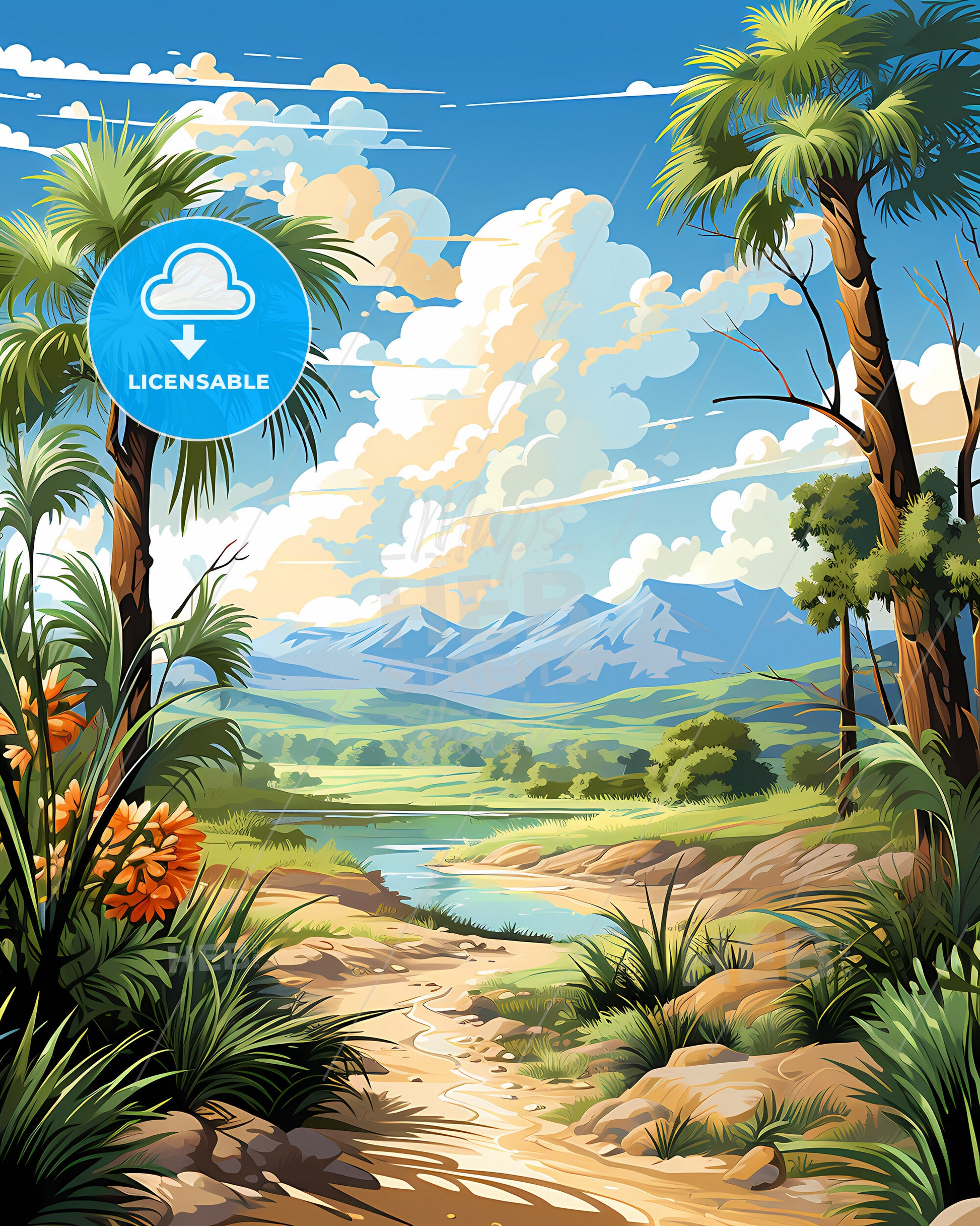 Eastvale, California, Skyline. art painting with blue sky some bright clouds in spring. in style of classic advertising illustration with nice gradients. Nice strokes and outlines that captures the playful spirit and vivid imagination of modern art.