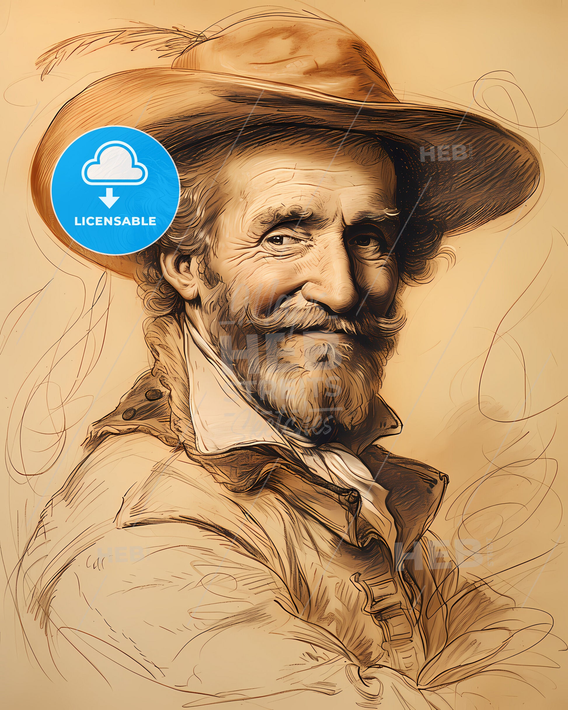 Portrait of Eberhard of Württemberg, 1614 - 1674, Explorer - smiling and winking. Vintage art illustration on bright beige paper background, sweeping overdrawn lines, subtile colored artwork, that captures the playful spirit and vivid imagination of modern art.