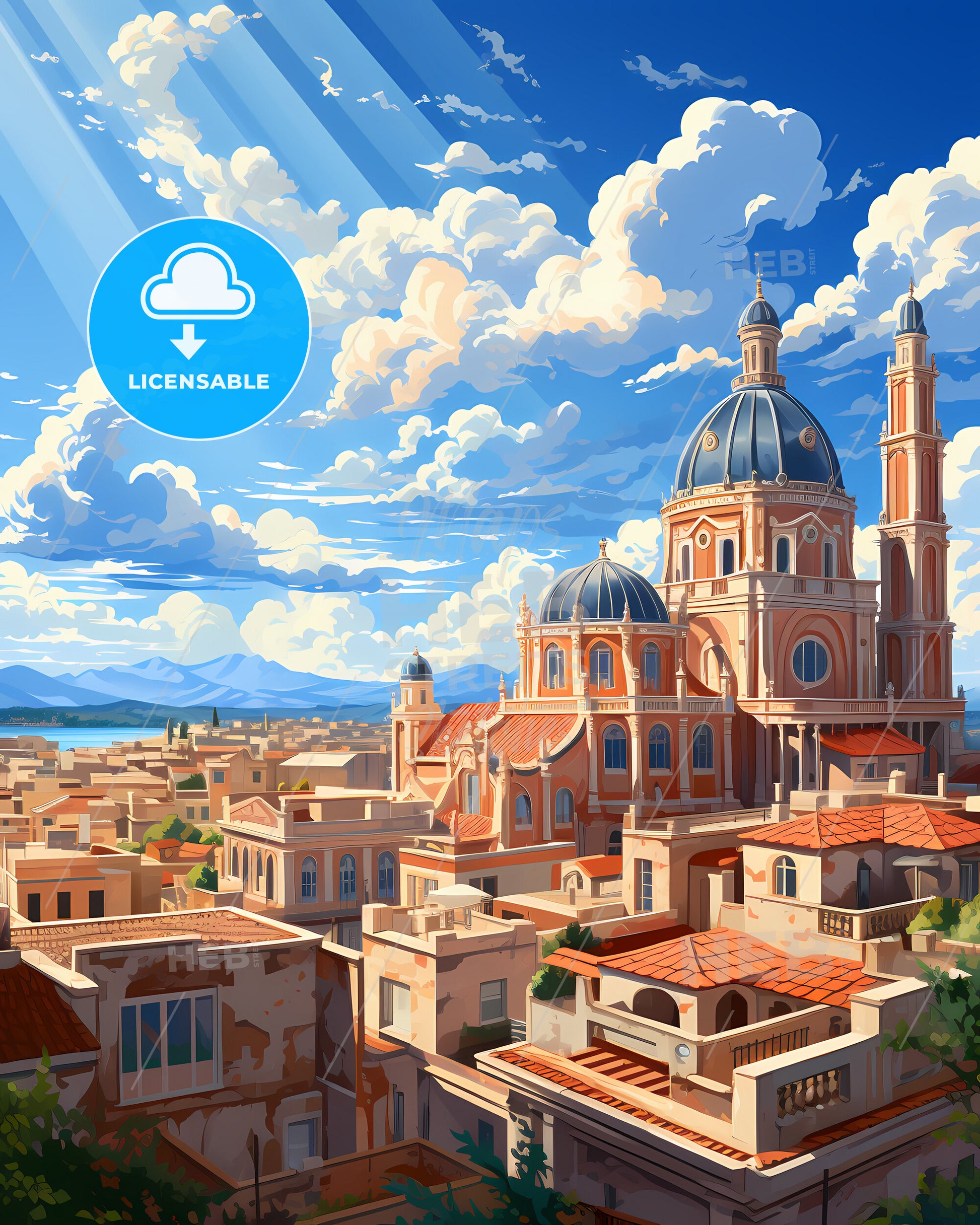 Elche, Alicante, Spain, Skyline. art painting with blue sky some bright clouds in spring. in style of classic advertising illustration with nice gradients. Nice strokes and outlines that captures the playful spirit and vivid imagination of modern art.