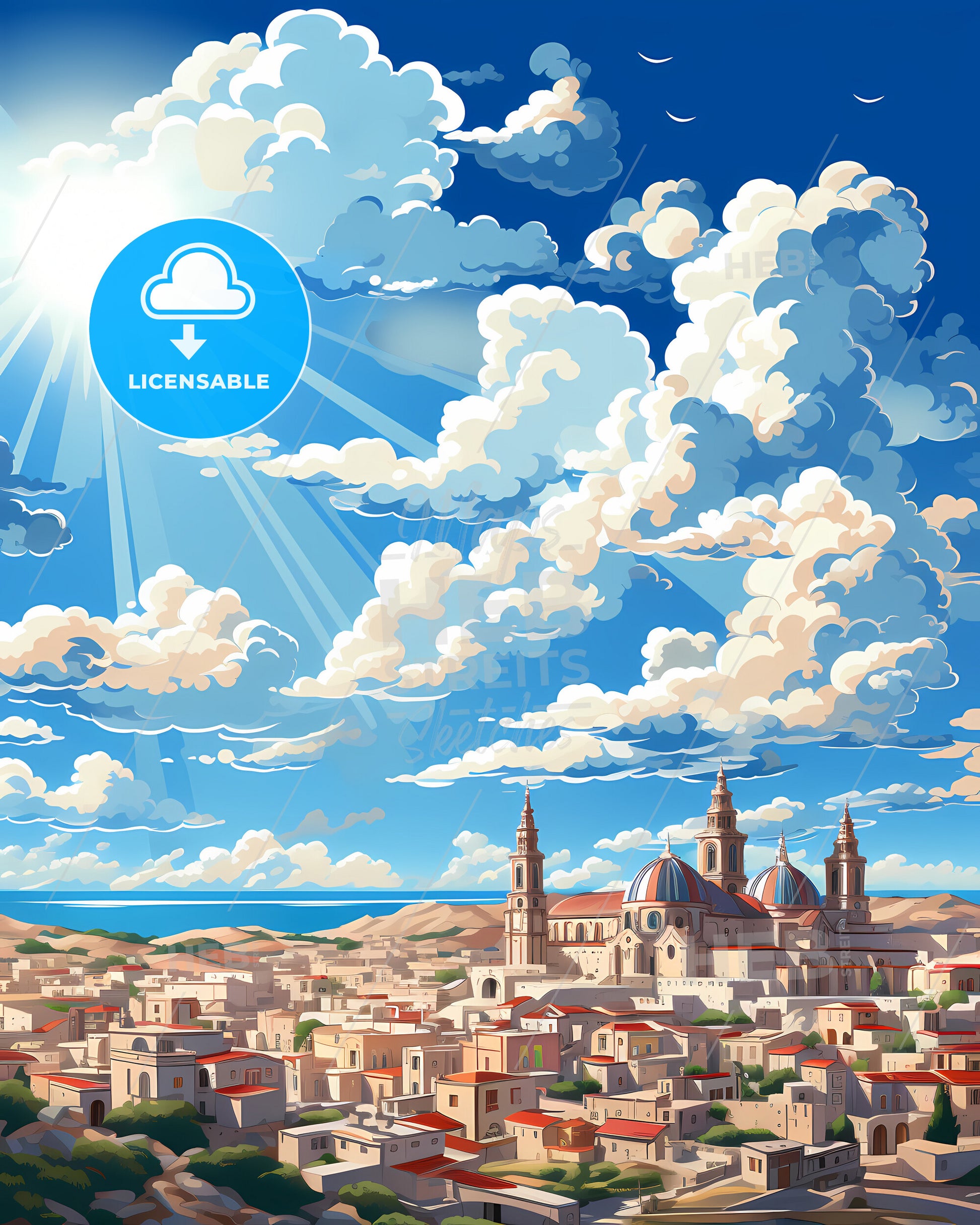 Elche, Alicante, Spain, Skyline. art painting with blue sky some bright clouds in spring. in style of classic advertising illustration with nice gradients. Nice strokes and outlines that captures the playful spirit and vivid imagination of modern art.