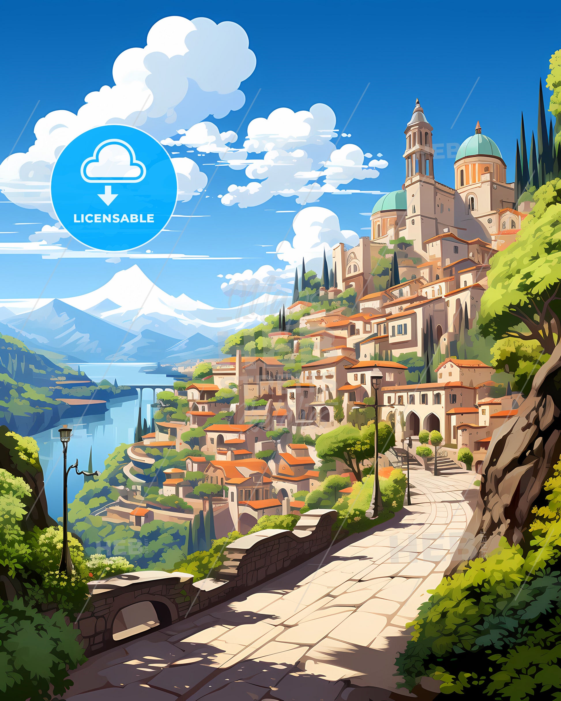 Ercolano, Campania, Italy, Skyline. art painting with blue sky some bright clouds in spring. in style of classic advertising illustration with nice gradients. Nice strokes and outlines that captures the playful spirit and vivid imagination of modern art.