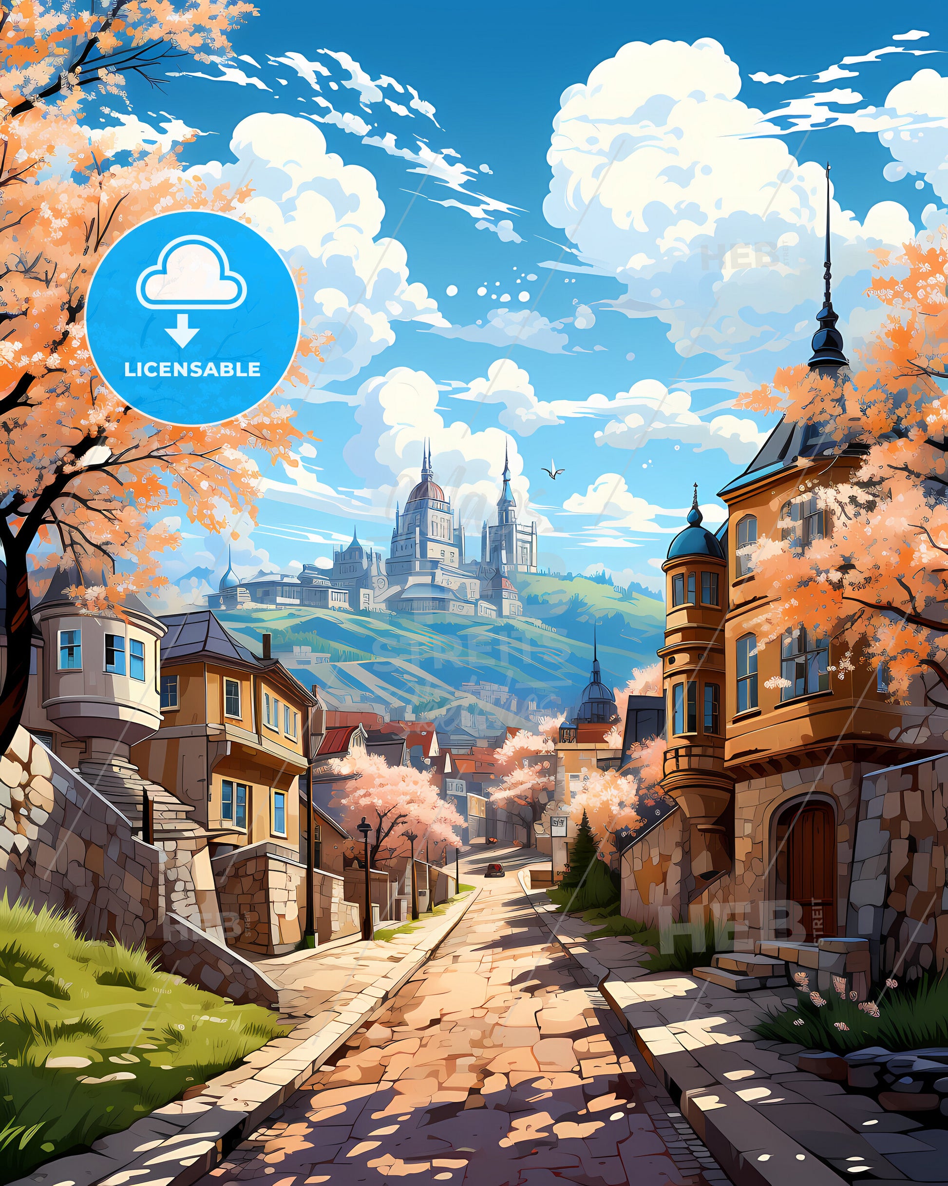 Erie, Pennsylvania, Skyline. art painting with blue sky some bright clouds in spring. in style of classic advertising illustration with nice gradients. Nice strokes and outlines that captures the playful spirit and vivid imagination of modern art.