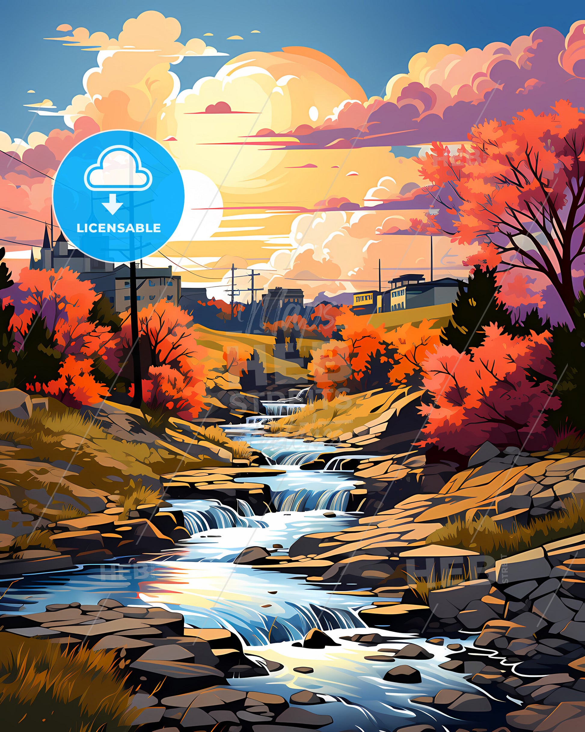 Evansville, Indiana, Skyline. art painting with blue sky some bright clouds in spring. in style of classic advertising illustration with nice gradients. Nice strokes and outlines that captures the playful spirit and vivid imagination of modern art.