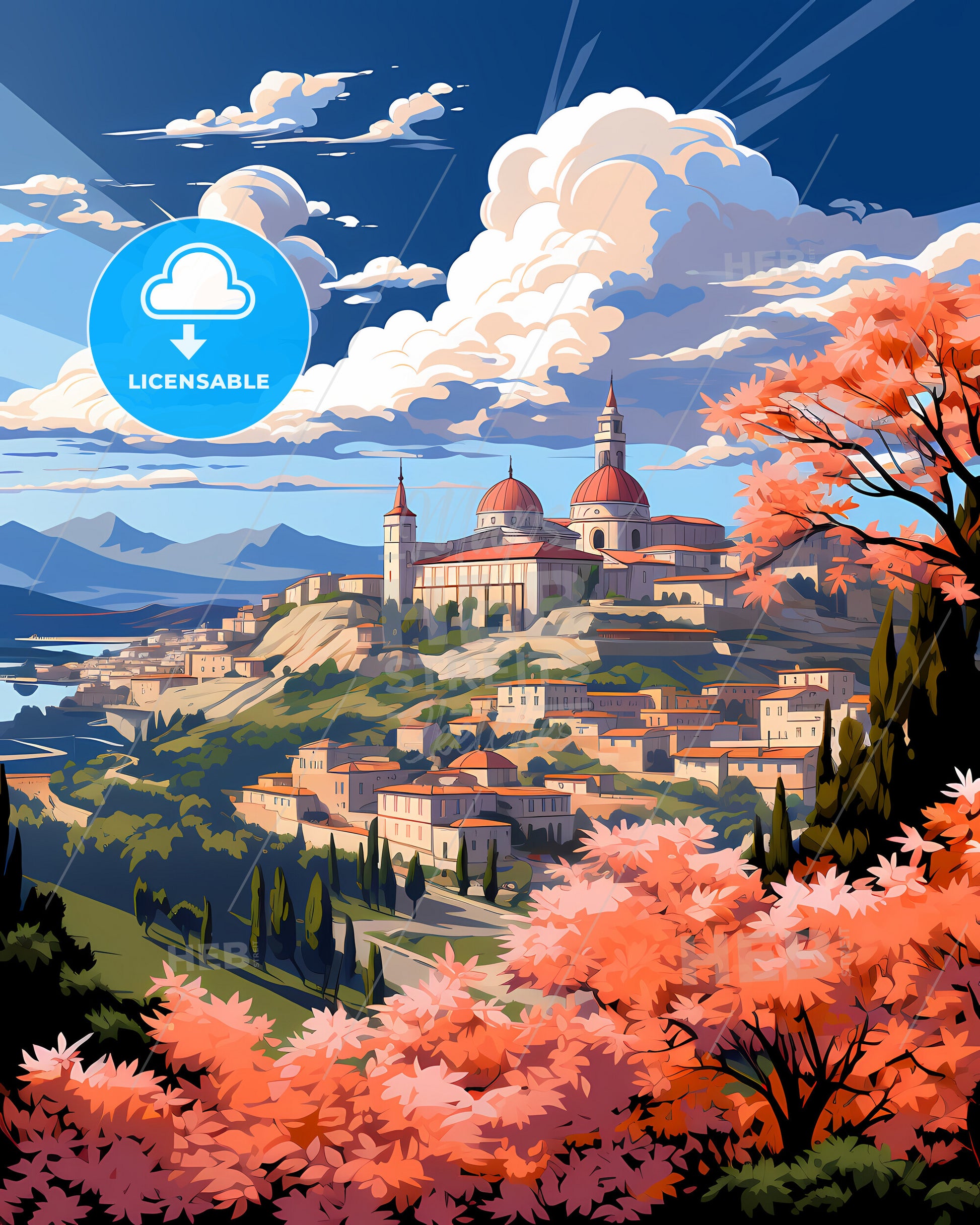 Fano, Marche, Italy, Skyline. art painting with blue sky some bright clouds in spring. in style of classic advertising illustration with nice gradients. Nice strokes and outlines that captures the playful spirit and vivid imagination of modern art.