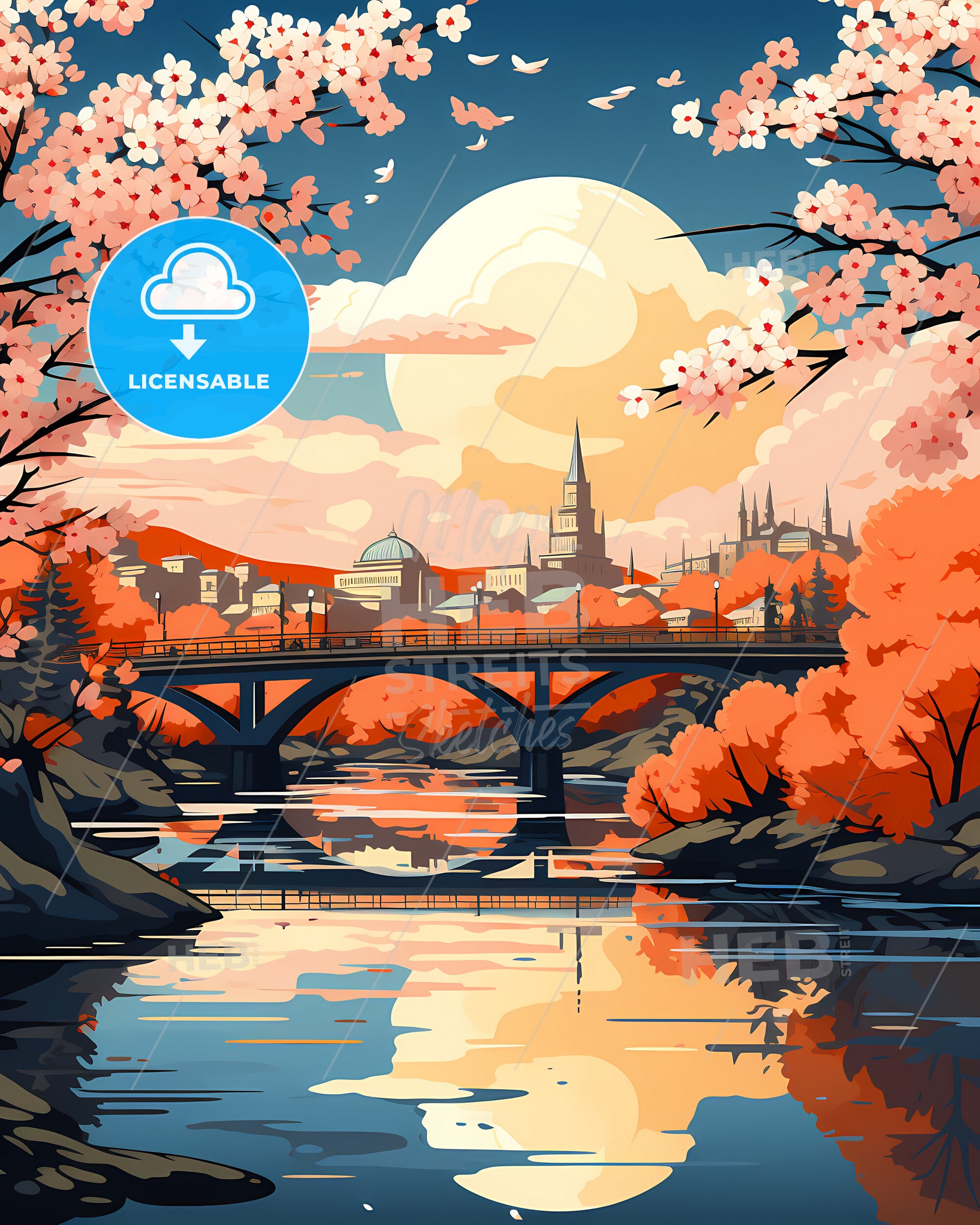 Fargo, North Dakota, Skyline. art painting with blue sky some bright clouds in spring. in style of classic advertising illustration with nice gradients. Nice strokes and outlines that captures the playful spirit and vivid imagination of modern art.