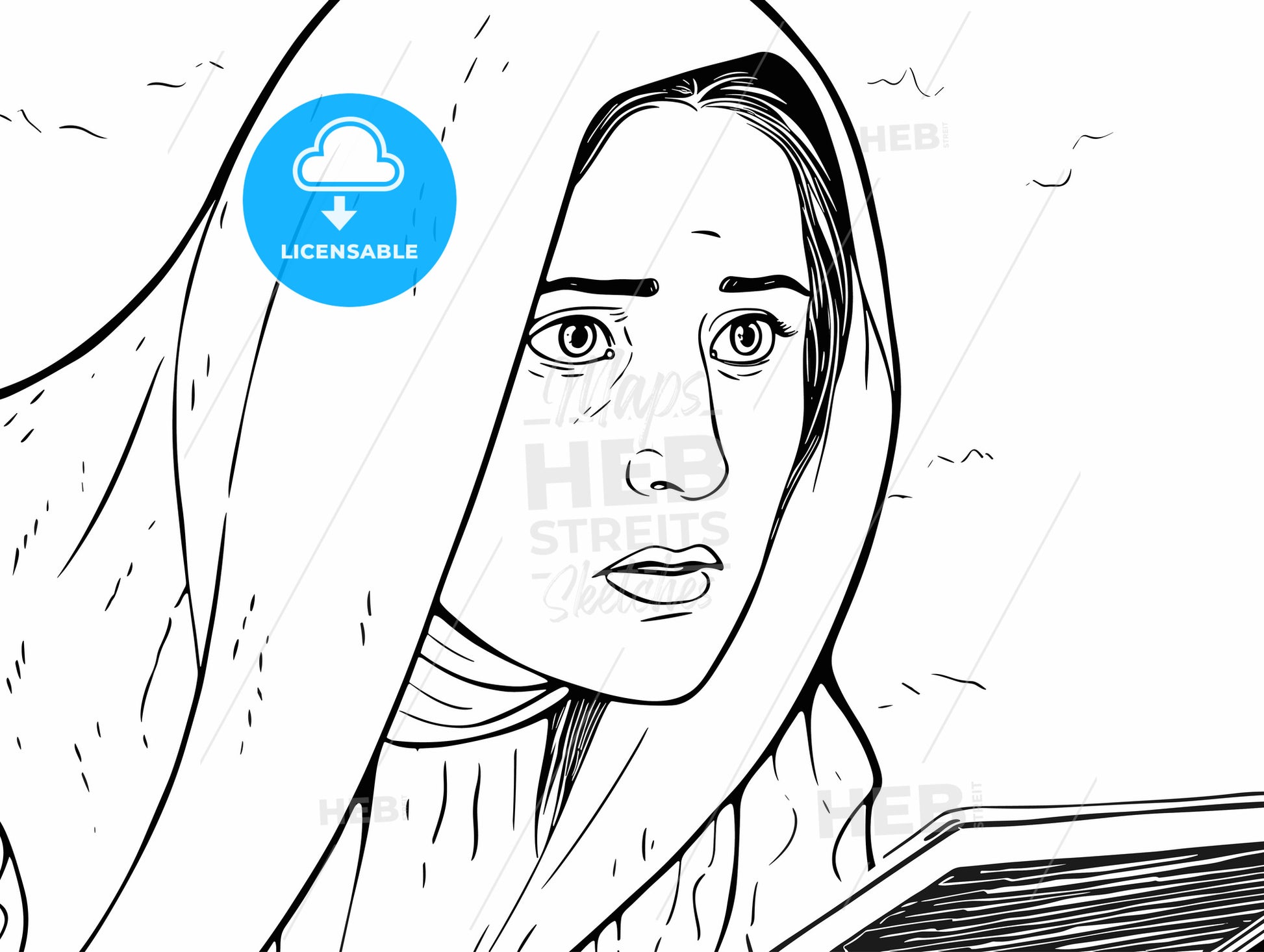 Female Student Partially Smiling While Looking At Laptop - a black and white drawing of a woman reading a book