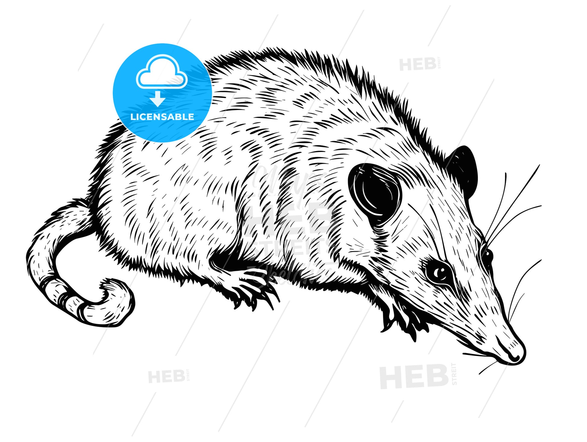Flat Woodcut Of A Crawling White Opossum Rat. - a black and white drawing of a rat