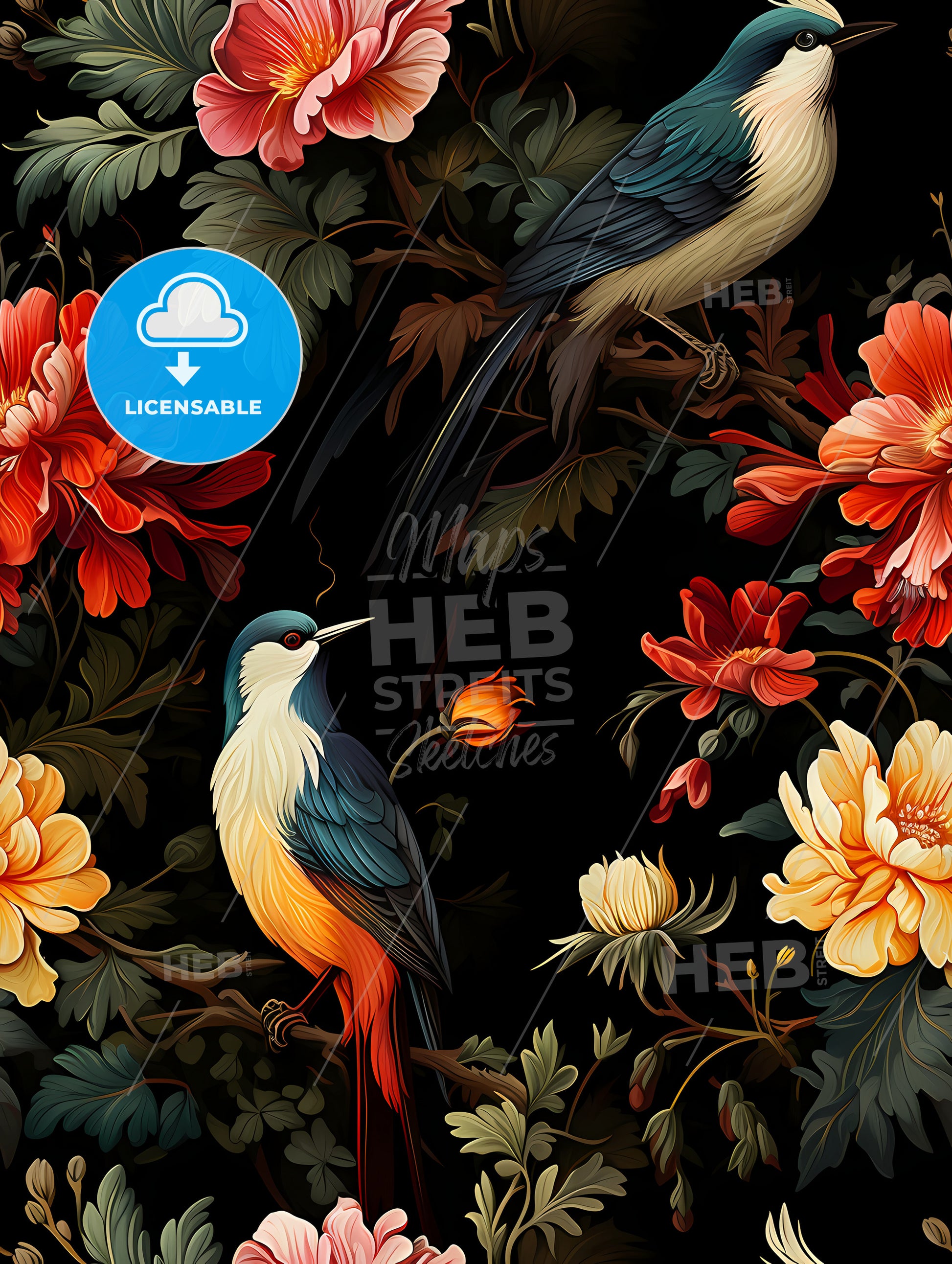 Foliate Pattern With Birds - a colorful bird on a branch with flowers