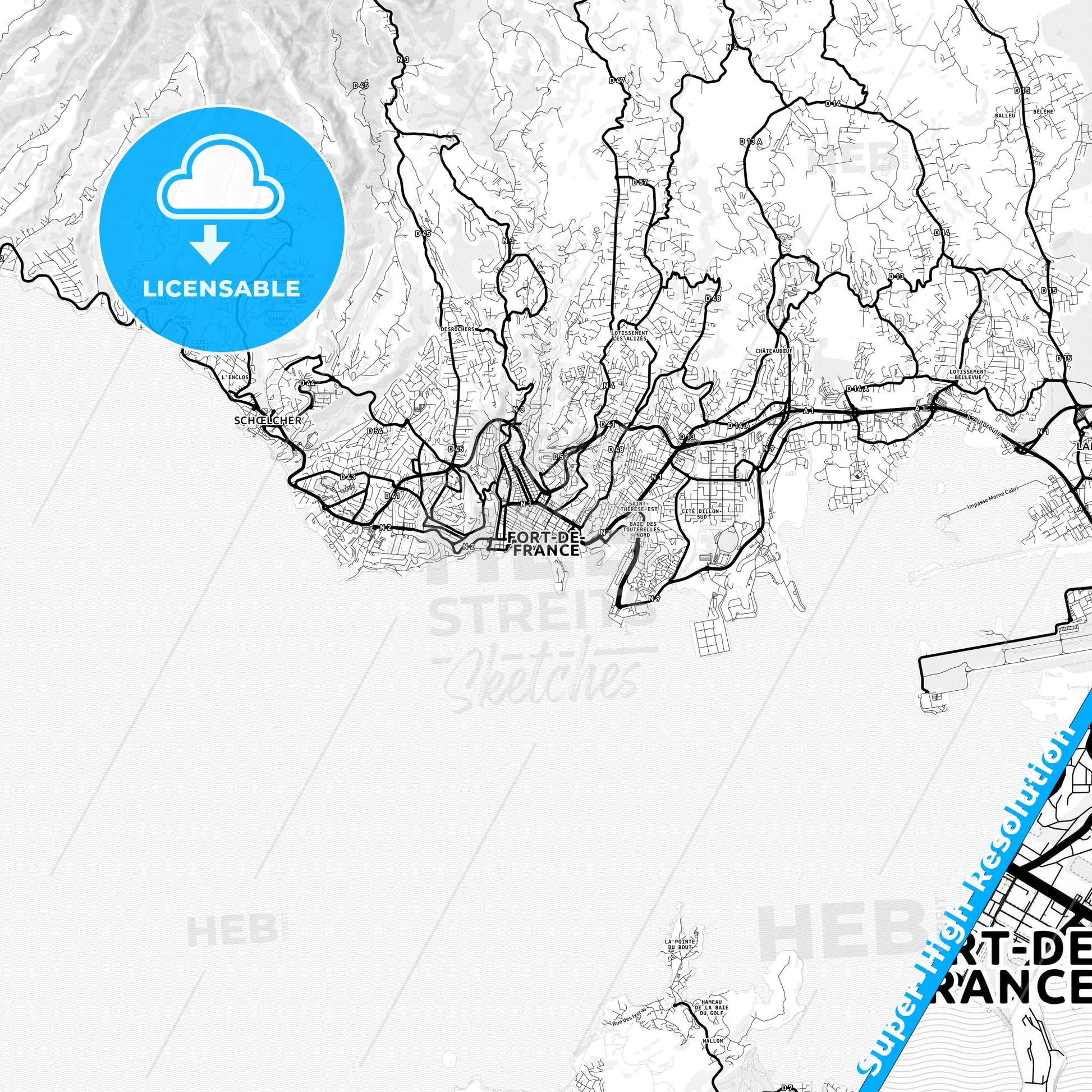 Fort-de-France, Martinique, France in high-resolution, minimalist map designed for printed use. This detailed black and white map accurately highlights the street network and urban layout, making it an ideal ready-to-use map for your business.