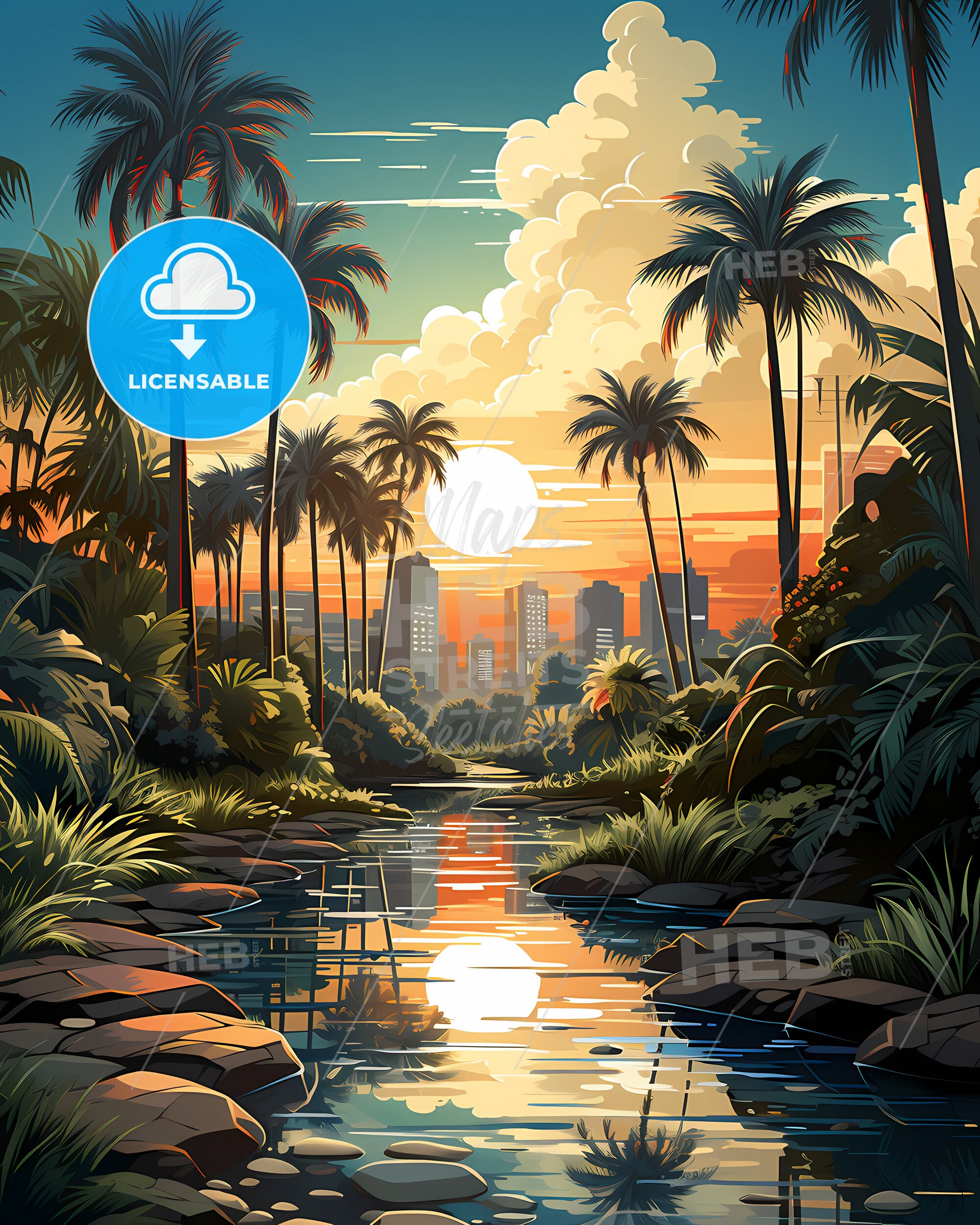 Fort Lauderdale, Florida, Skyline. art painting with blue sky some bright clouds in spring. in style of classic advertising illustration with nice gradients. Nice strokes and outlines that captures the playful spirit and vivid imagination of modern art.