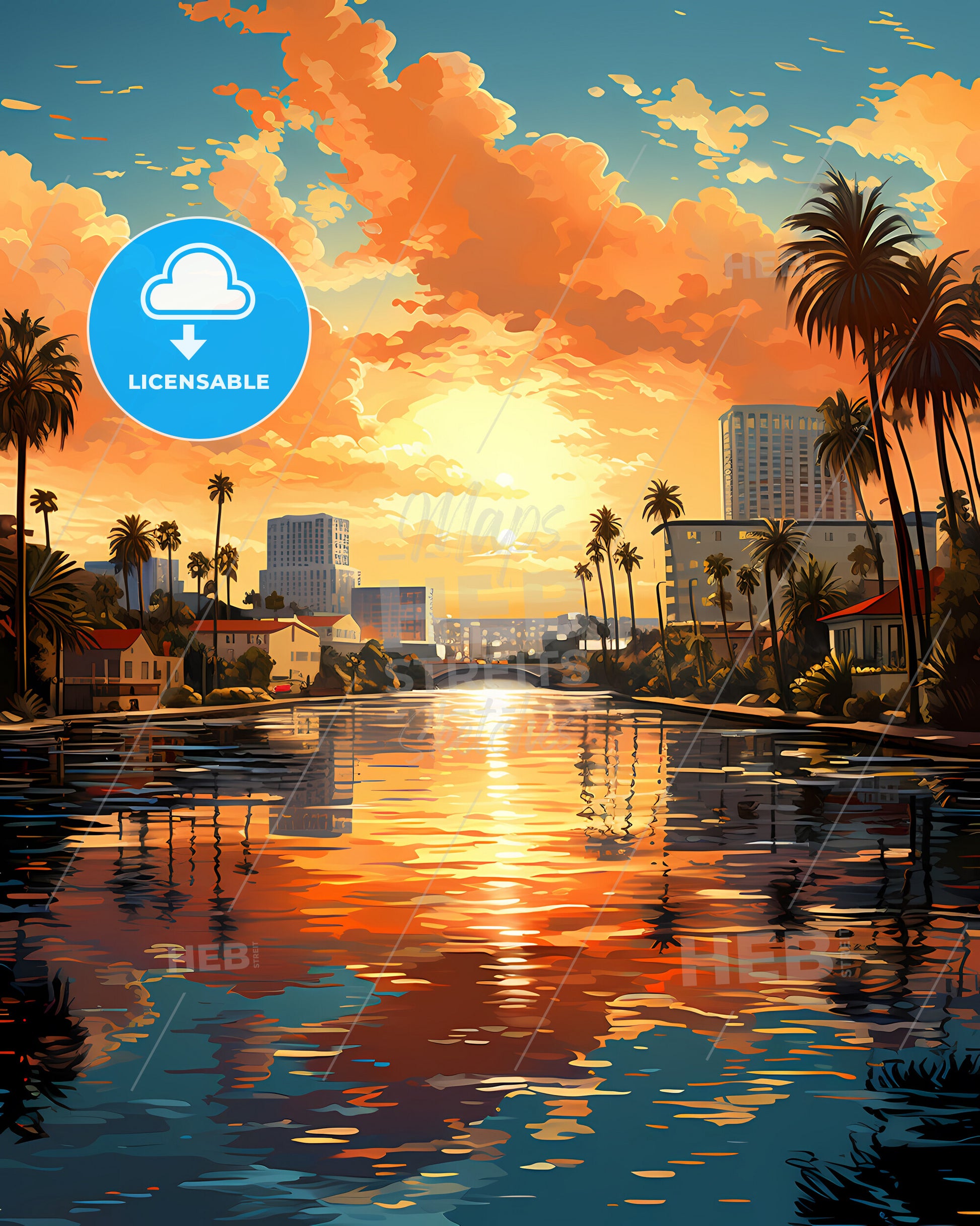 Fort Lauderdale, Florida, Skyline. art painting with blue sky some bright clouds in spring. in style of classic advertising illustration with nice gradients. Nice strokes and outlines that captures the playful spirit and vivid imagination of modern art.