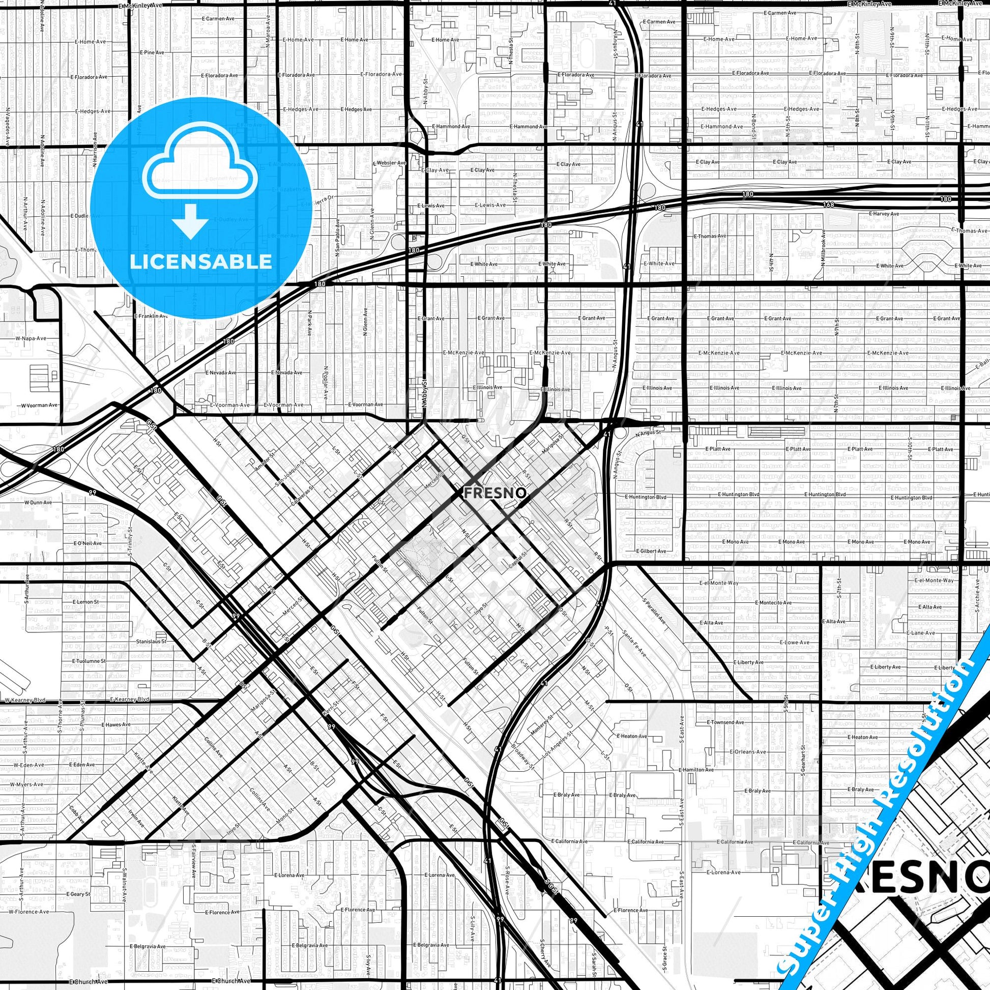 Fresno, California, California in high-resolution, minimalist map designed for printed use. This detailed black and white map accurately highlights the street network and urban layout, making it an ideal ready-to-use map for your business.
