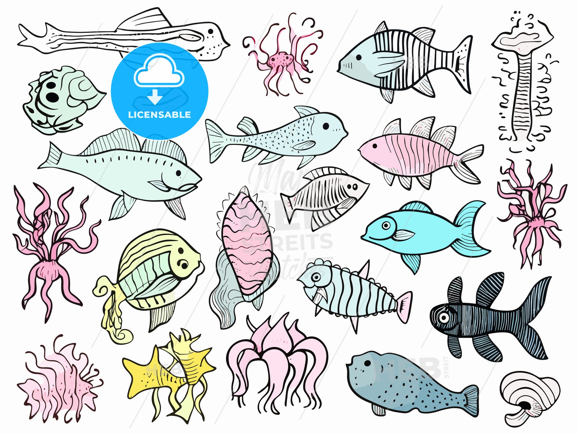 Funny Cut Baby Sea Creatures In Pastel Color. - a collection of different fish