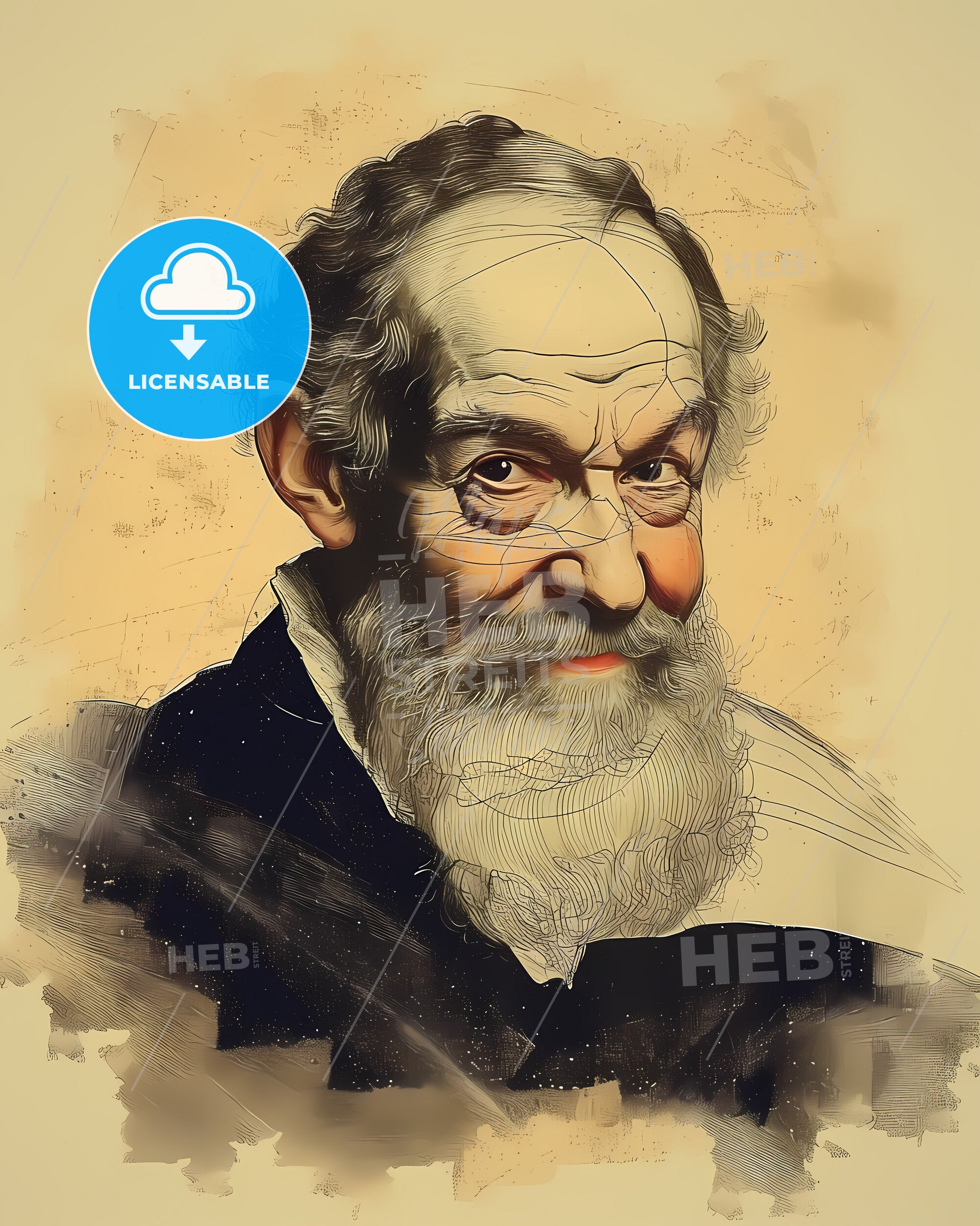 Portrait of Galileo Galilei, 1564 - 1642, Astronomer and Physicist - smiling and winking. Vintage art illustration on bright beige paper background, sweeping overdrawn lines, subtile colored artwork, that captures the playful spirit and vivid imagination of modern art.