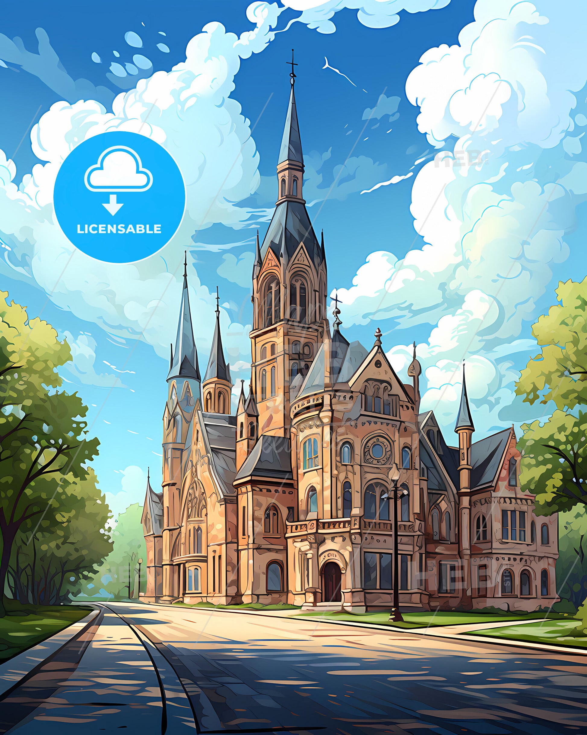 Gary, Indiana, Skyline. art painting with blue sky some bright clouds in spring. in style of classic advertising illustration with nice gradients. Nice strokes and outlines that captures the playful spirit and vivid imagination of modern art.