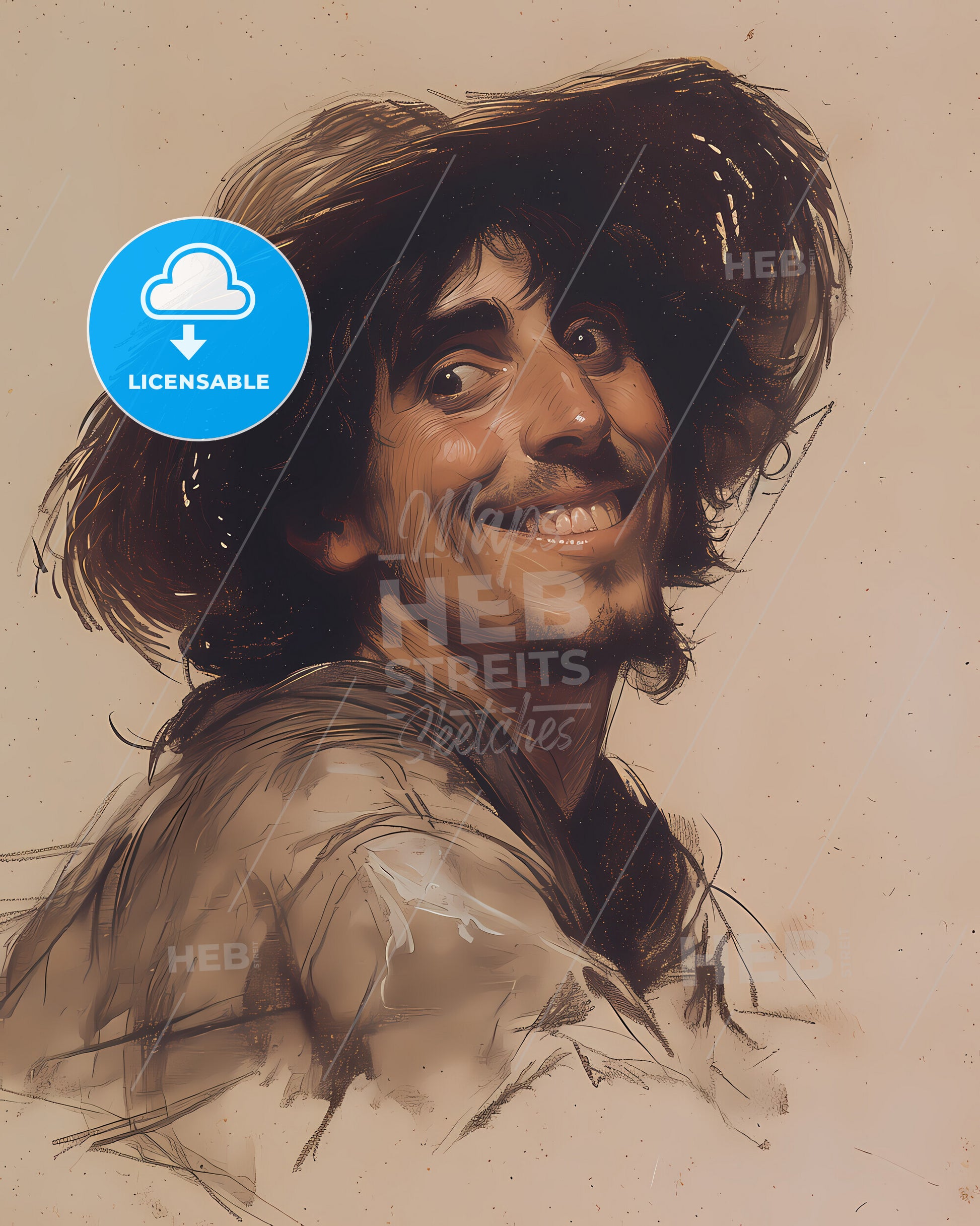 Portrait of Gaspar de Portolá , 1716 - 1786, Explorer - smiling and winking. Vintage art illustration on bright beige paper background, sweeping overdrawn lines, subtile colored artwork, that captures the playful spirit and vivid imagination of modern art.