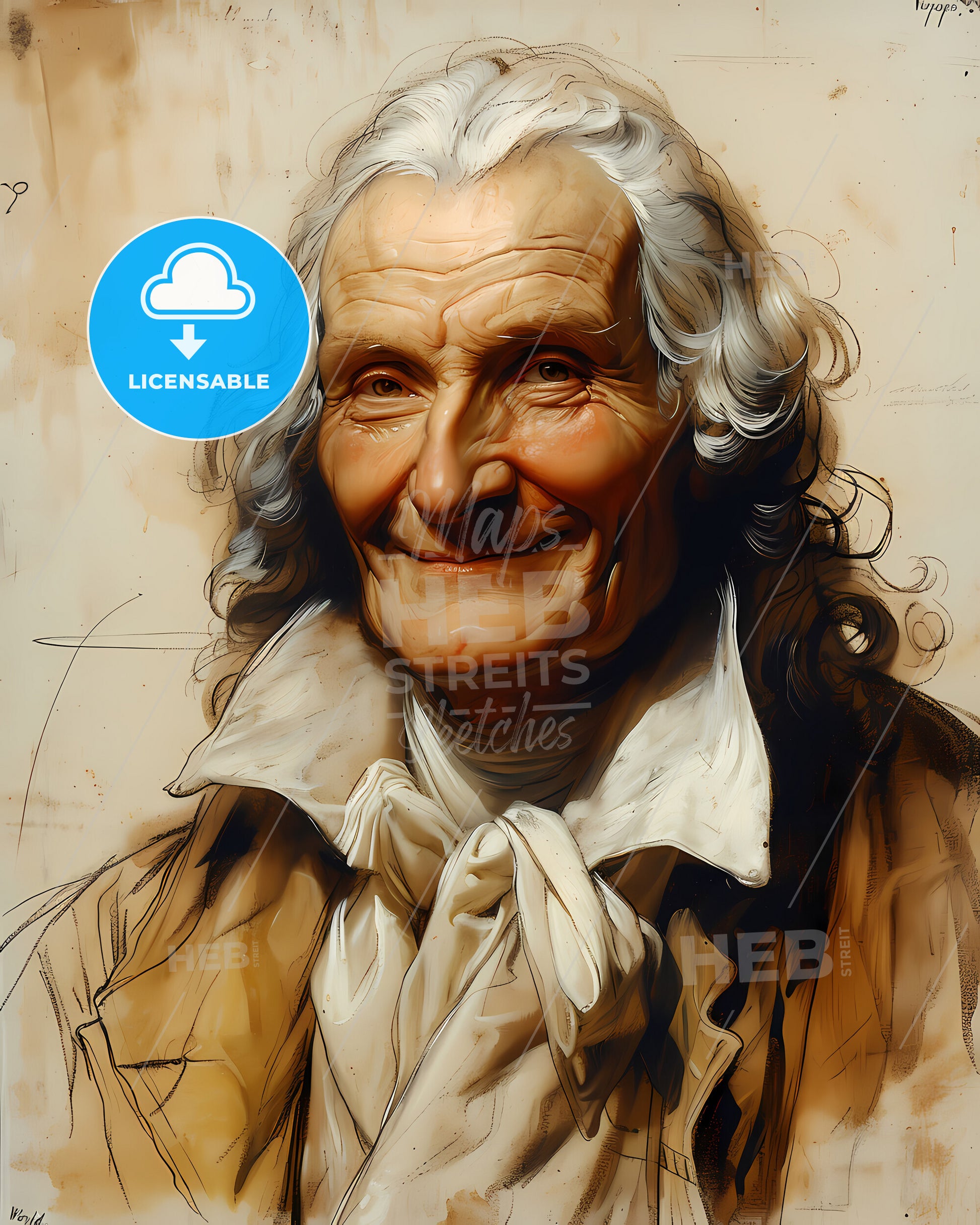 Portrait of George Anson, 1697 - 1762, Explorer, British Admiral and circumnavigator, known for his global circumnavigation and his book "Voyage Round the World." smiling. Vintage art illustration on bright beige paper background, sweeping overdrawn lines, subtile colored artwork, that captures the playful spirit and vivid imagination of modern art.