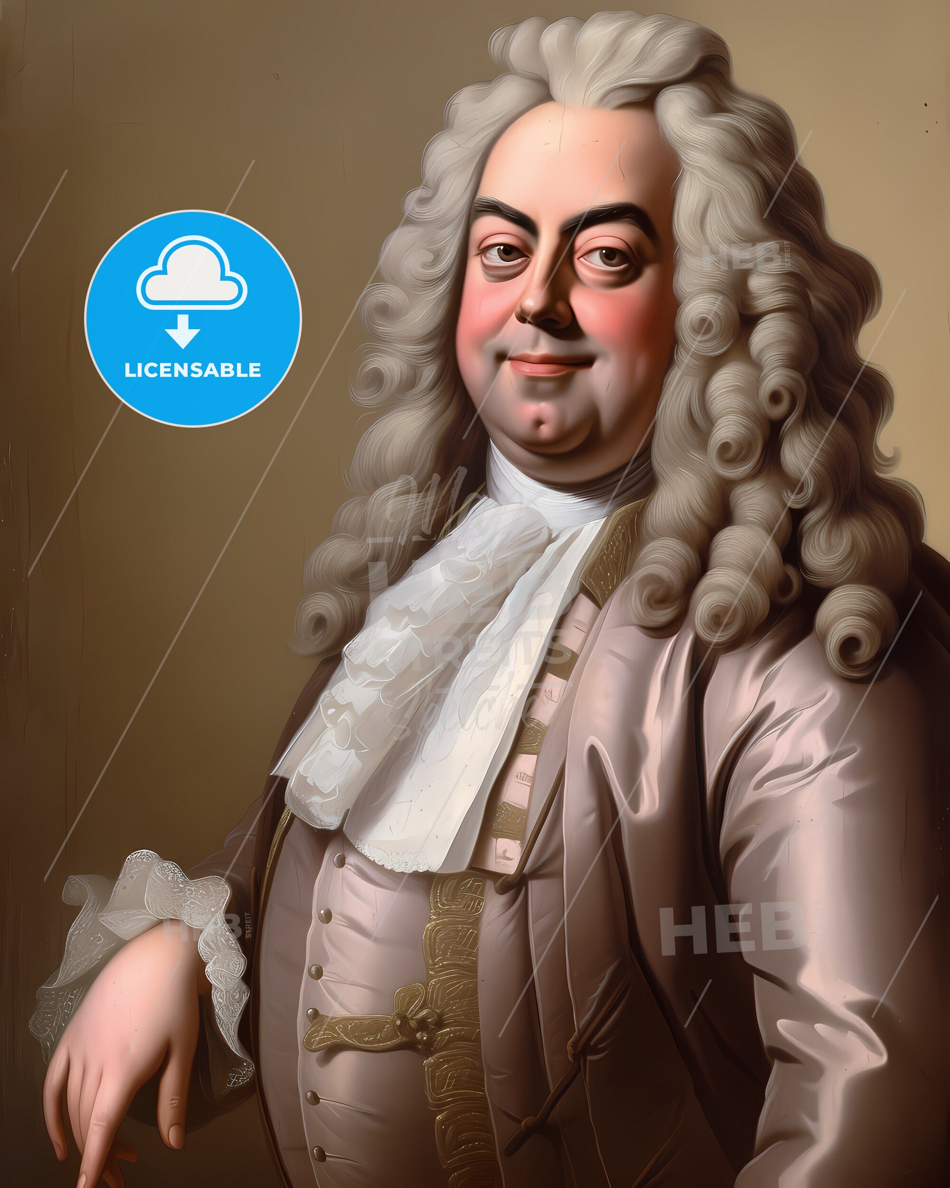 Portrait of George Frideric Handel, 1685 - 1759, Composer - smiling and winking. Vintage art illustration on bright beige paper background, sweeping overdrawn lines, subtile colored artwork, that captures the playful spirit and vivid imagination of modern art.