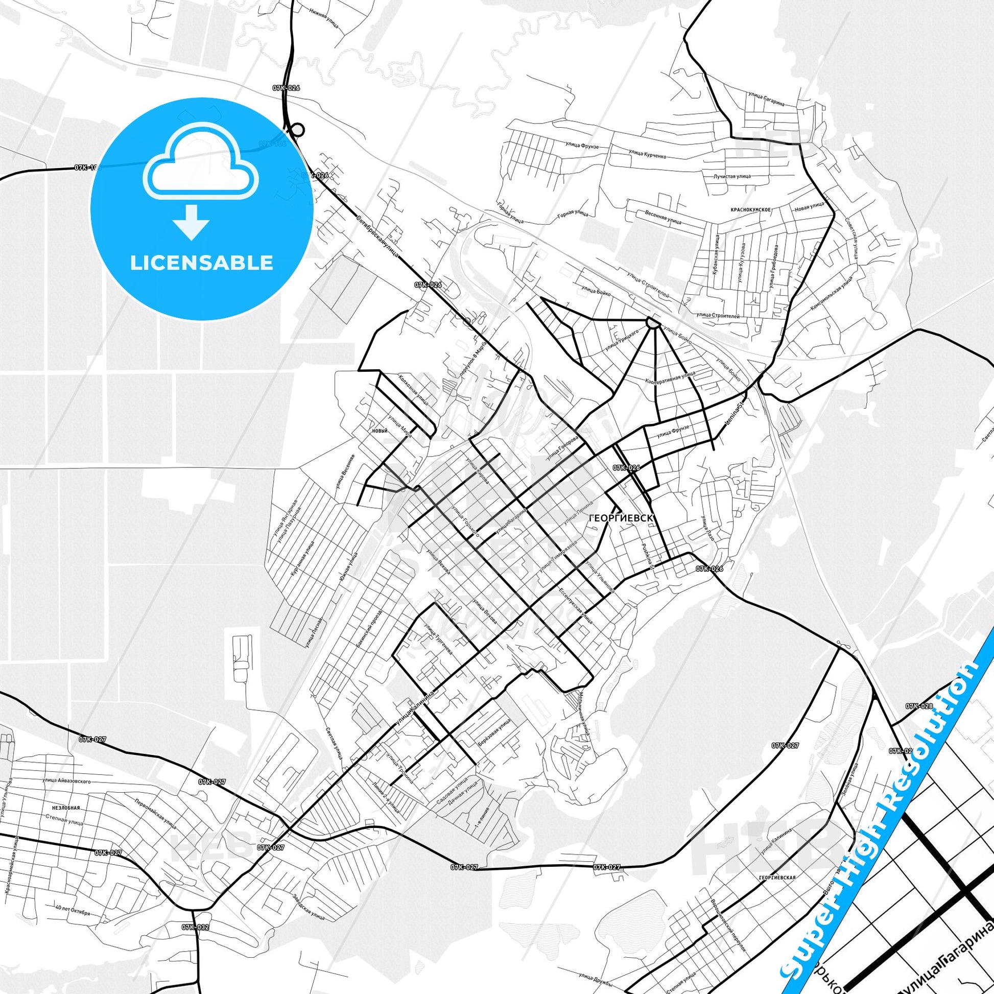 Georgiyevsk, Russia Light Map with Street Names, City Names, and Districts
