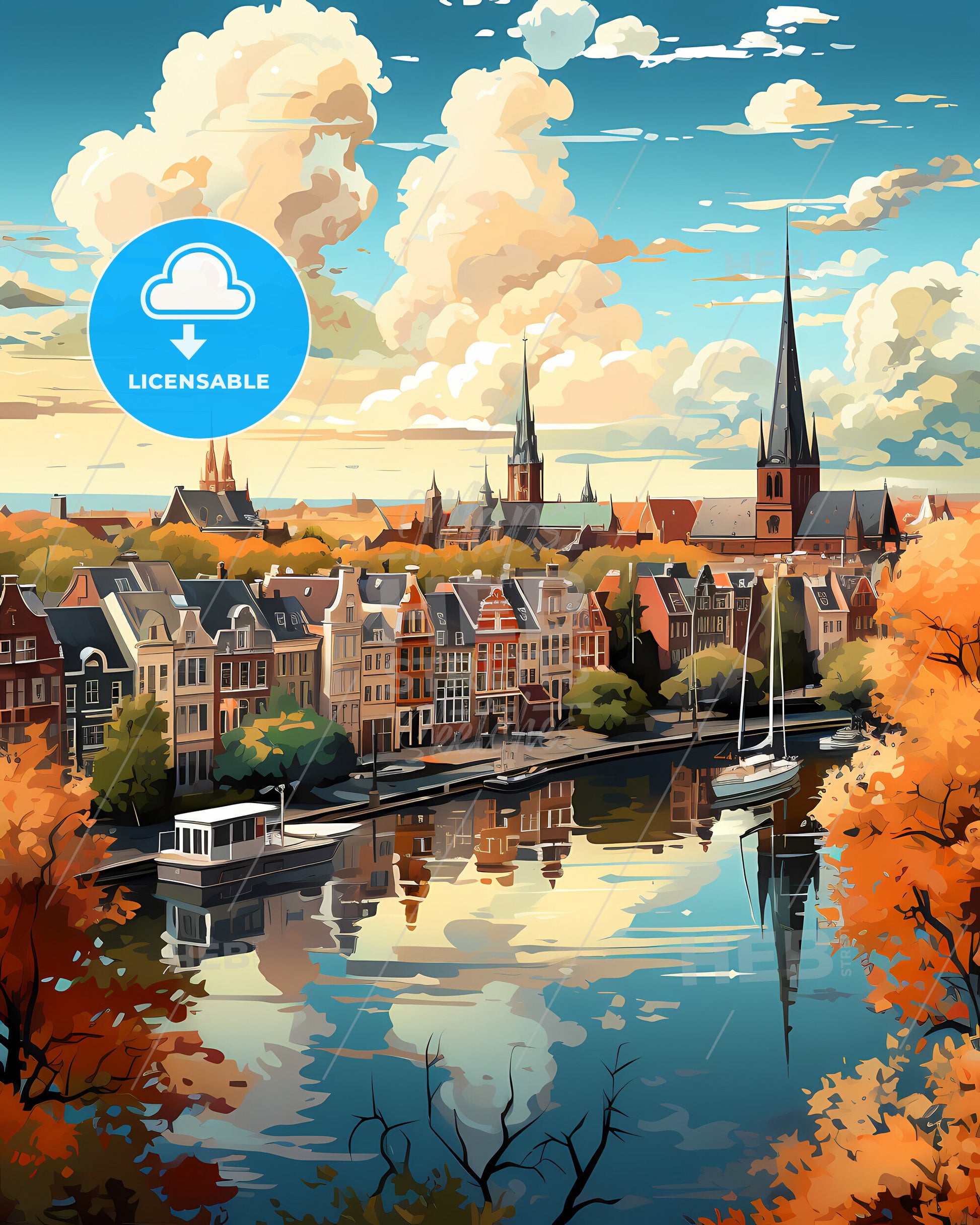 Haarlem, North Holland, Netherlands, Skyline. art painting with blue sky some bright clouds in spring. in style of classic advertising illustration with nice gradients. Nice strokes and outlines that captures the playful spirit and vivid imagination of modern art.