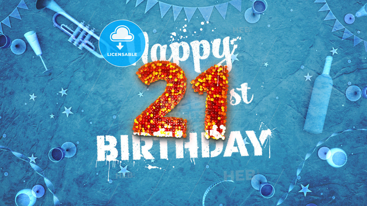 Happy 21st Birthday Card with beautiful details such as wine bottle, champagne glasses, garland, pennant, stars and confetti. Blue background, red and yellow figures from luminaries in the foreground. Sprayed typography. 3D design for printed cards and social media. Horizontal layout in the ratio 16 to 9.