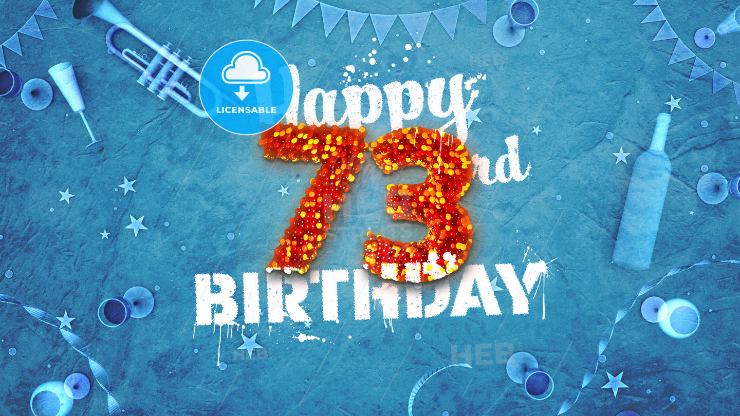 Happy 73rd Birthday Card with beautiful details such as wine bottle, champagne glasses, garland, pennant, stars and confetti. Blue background, red and yellow figures from luminaries in the foreground. Sprayed typography. 3D design for printed cards and social media. Horizontal layout in the ratio 16 to 9.