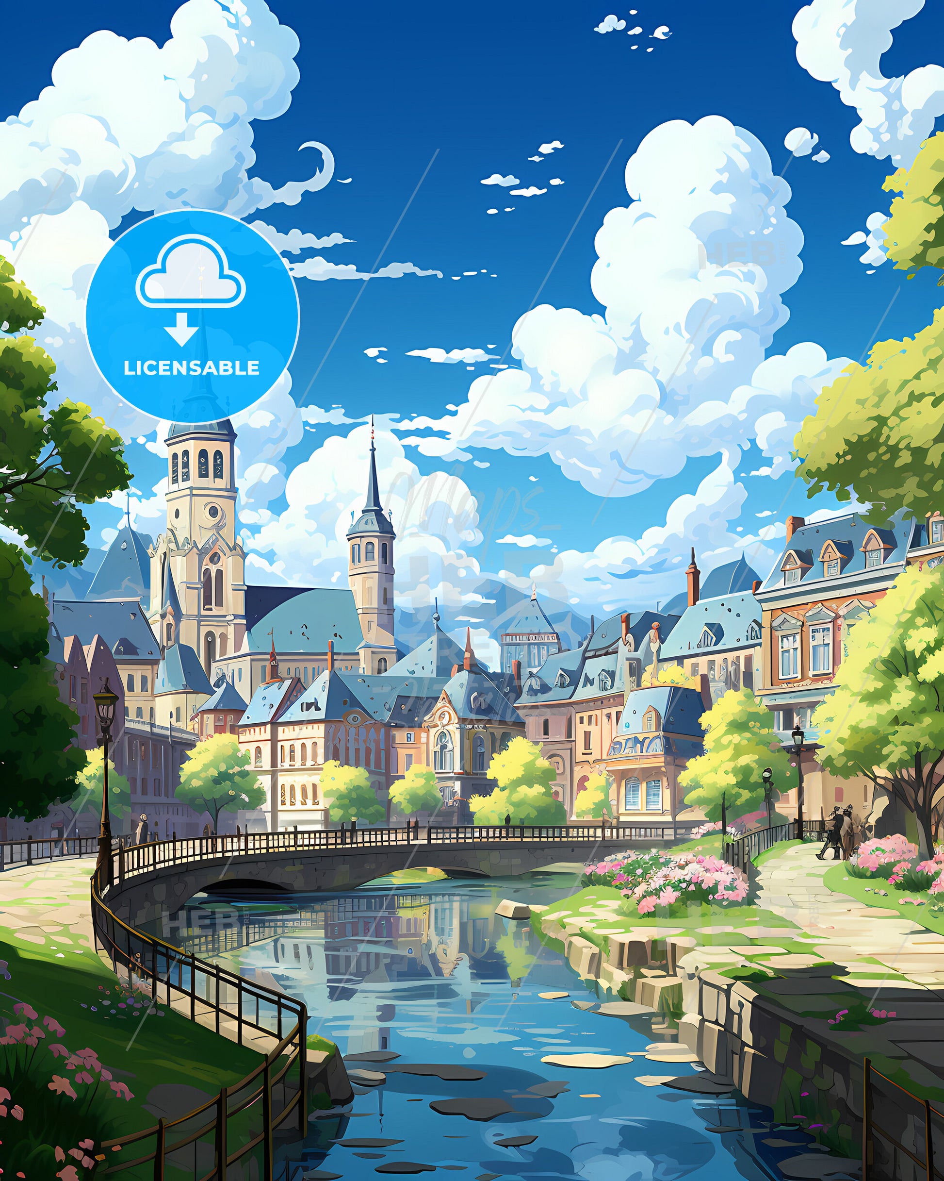 Harlingen, Texas, Skyline. art painting with blue sky some bright clouds in spring. in style of classic advertising illustration with nice gradients. Nice strokes and outlines that captures the playful spirit and vivid imagination of modern art.
