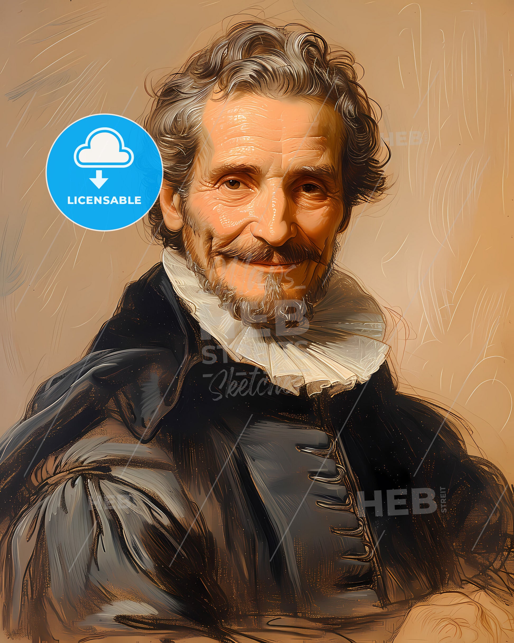 Portrait of Hernán Cortés, 1485 - 1547, Explorer, Spanish conquistador, led the expedition that caused the fall of the Aztec Empire. smiling. Vintage art illustration on bright beige paper background, sweeping overdrawn lines, subtile colored artwork, that captures the playful spirit and vivid imagination of modern art.