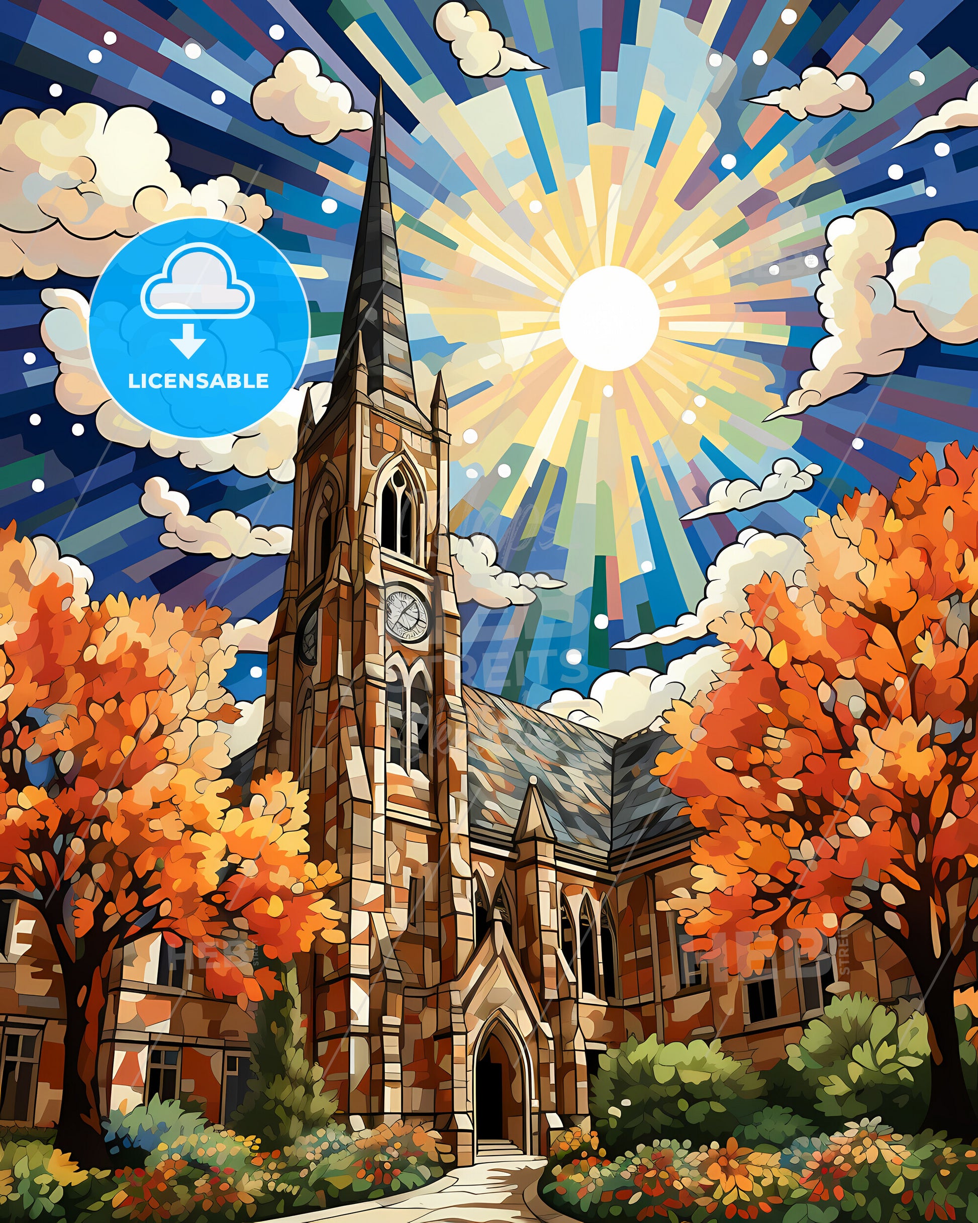 Hilversum, North Holland, Netherlands, Skyline. art painting with blue sky some bright clouds in spring. in style of classic advertising illustration with nice gradients. Nice strokes and outlines that captures the playful spirit and vivid imagination of modern art.