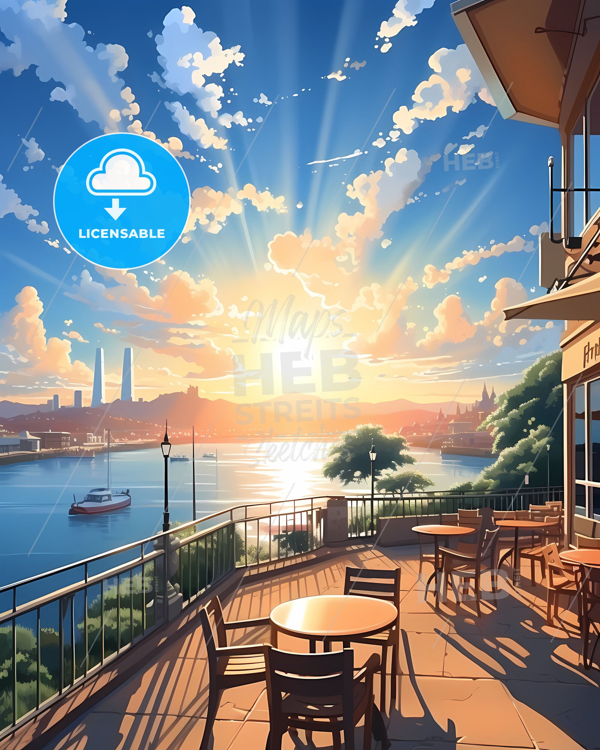 Hiroshima Japan Skyline Colorful Art Deck Chairs Canvas Oil Painting Waterfront Restaurant