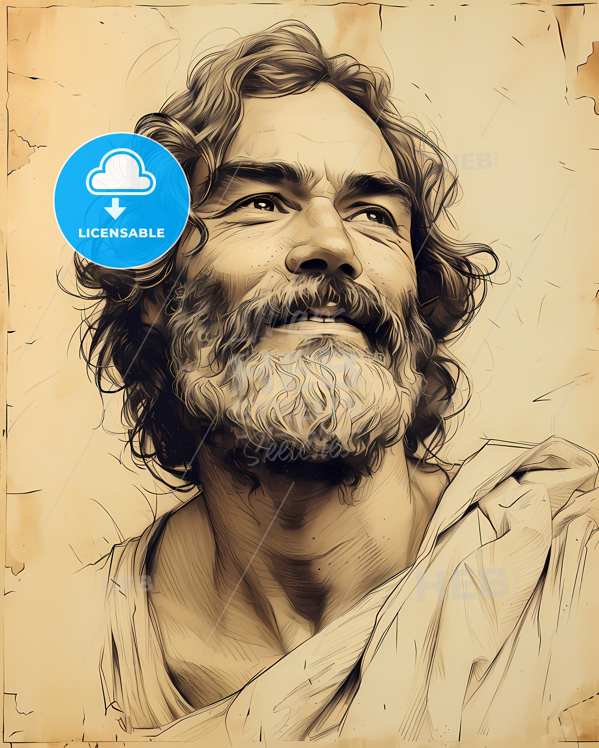 Portrait of Homer, c. 8th century BCE - c. 8th century BCE, Epic Poet, Author of the epic poems "Iliad" and "Odyssey," foundational works in Greek literature. smiling. Vintage art illustration on bright beige paper background, sweeping overdrawn lines, subtile colored artwork, that captures the playful spirit and vivid imagination of modern art.