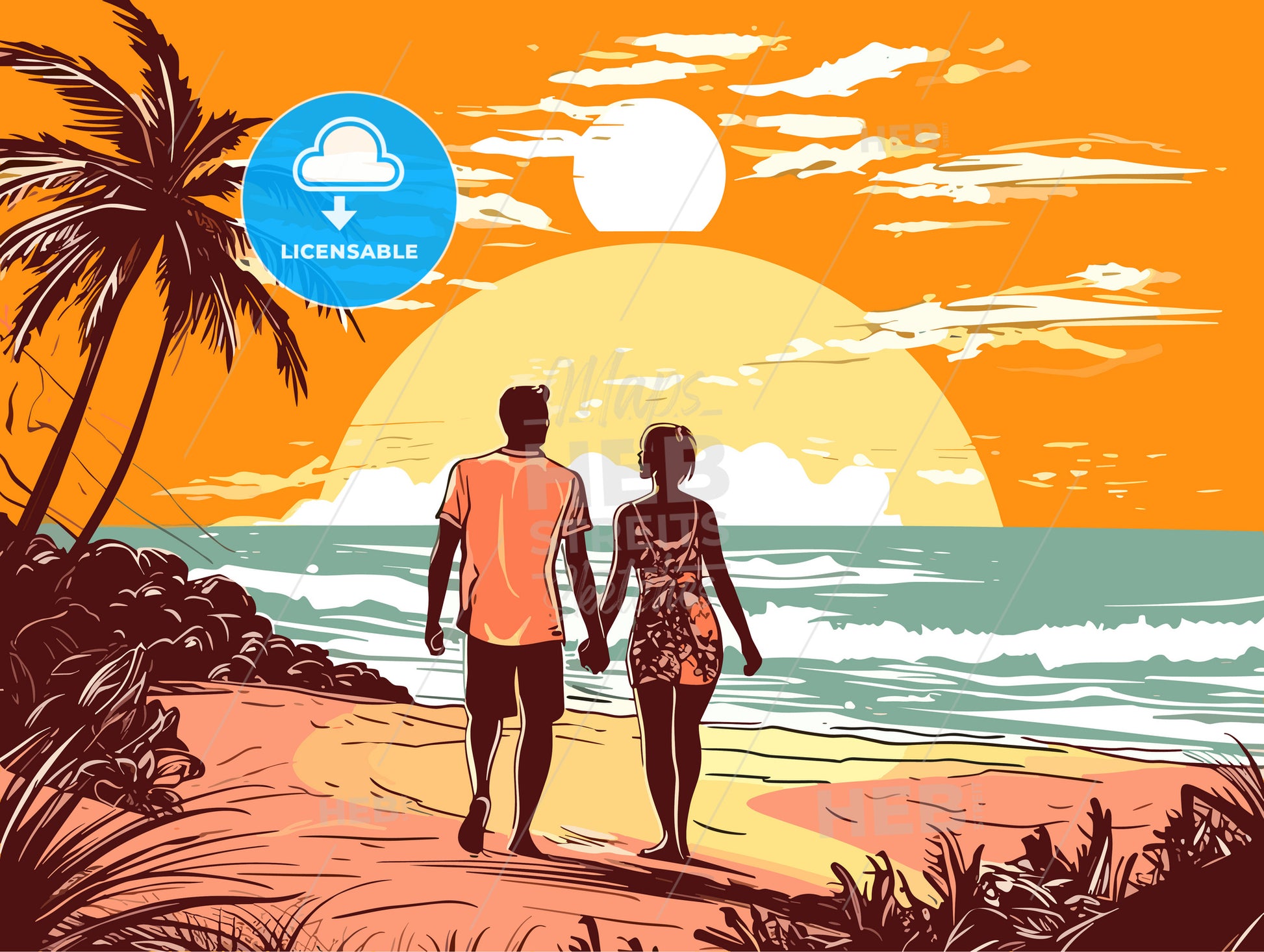 Honeymoon Couple Romantic In Love At Beach - a man and woman holding hands on a beach