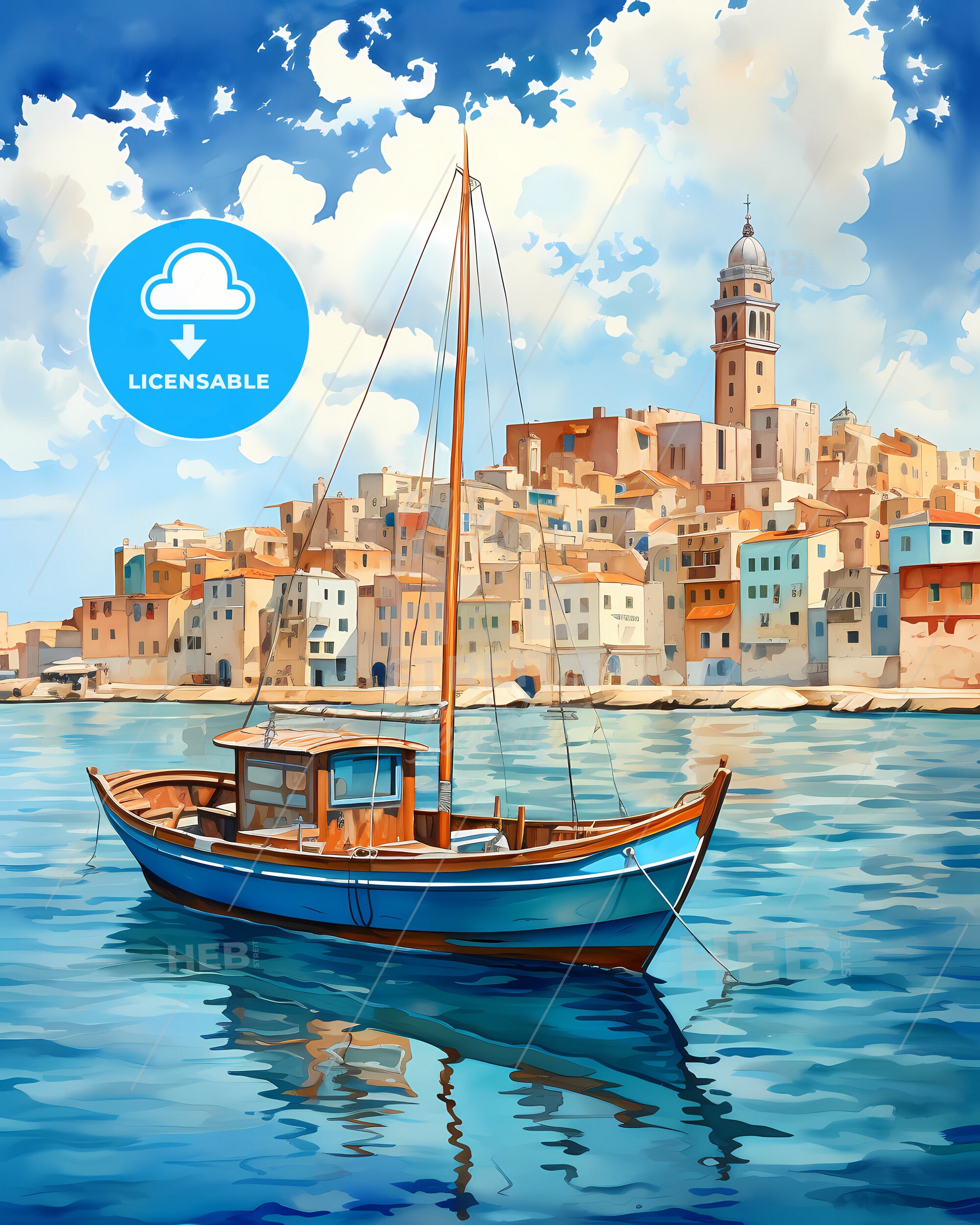 Hoorn, North Holland, Netherlands, Skyline. art painting with blue sky some bright clouds in spring. in style of classic advertising illustration with nice gradients. Nice strokes and outlines that captures the playful spirit and vivid imagination of modern art.