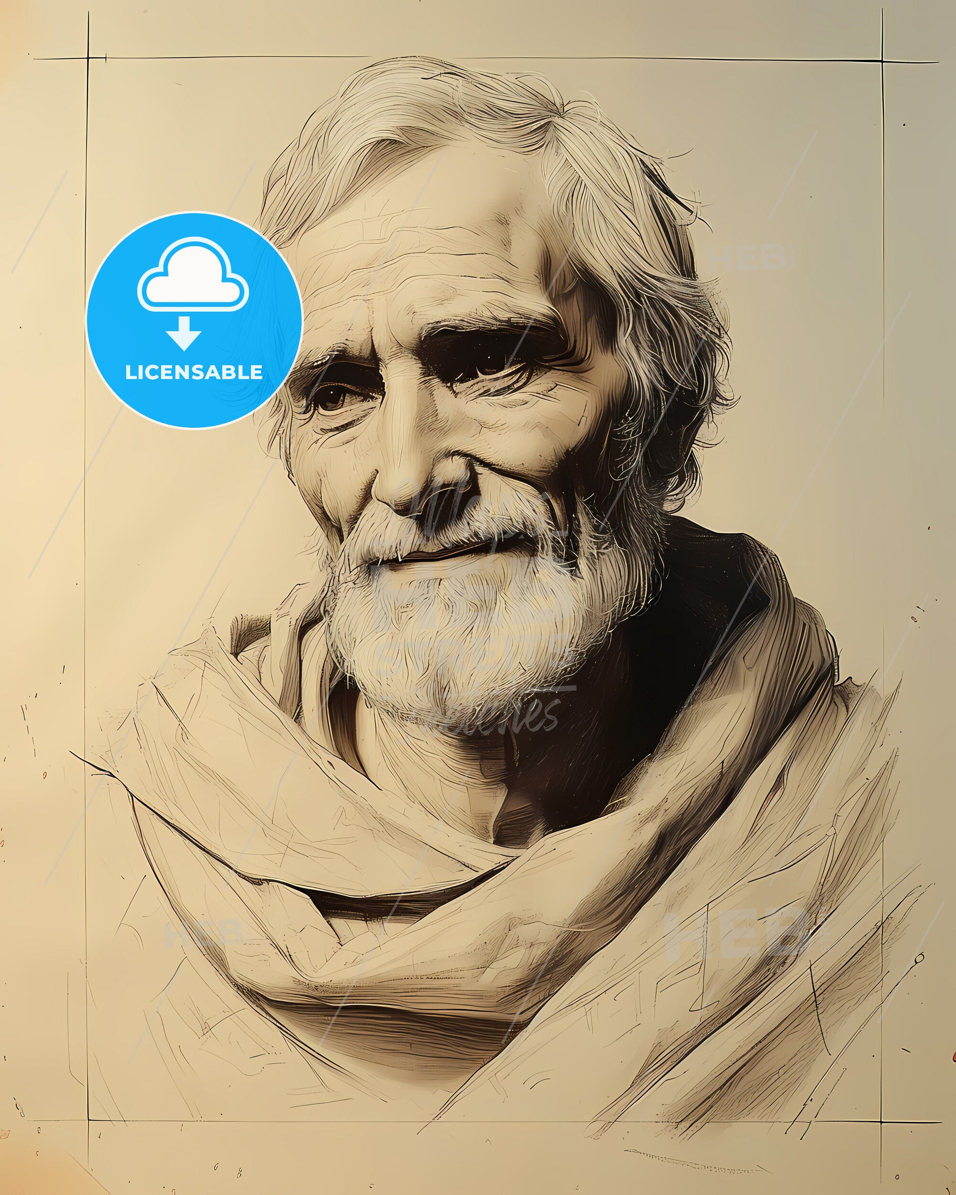 Portrait of Hrolf Kraki, c. 6th century - c. 580, Legendary Danish King, Subject of heroic poetry, known for his exploits and tragic fate. smiling. Vintage art illustration on bright beige paper background - historic art style, sweeping overdrawn lines, subtile colored artwork, that captures the playful spirit and vivid imagination of modern art.