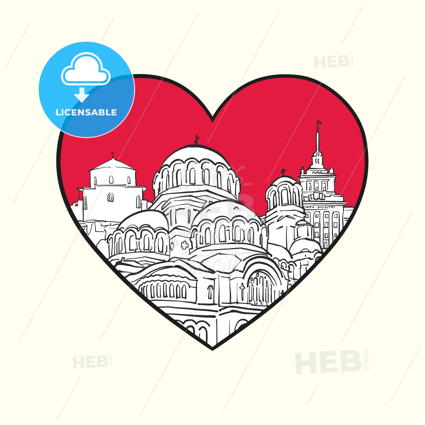 I love Sofia. Red heart and famous buildings, Bulgaria Composition. Hand-drawn black and white vector illustration. Grouped and movable objects.