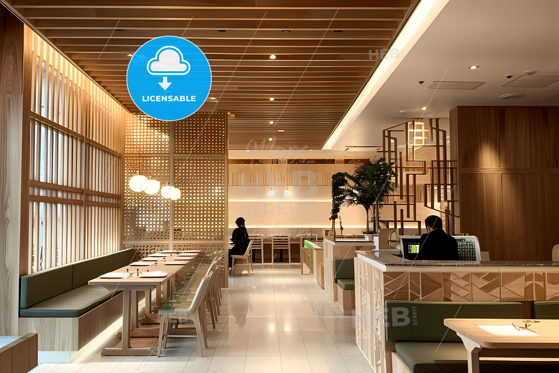 Modern Restaurant Interior with Light Wood, Wall Patterns, White Ceiling, and Vibrant Painting