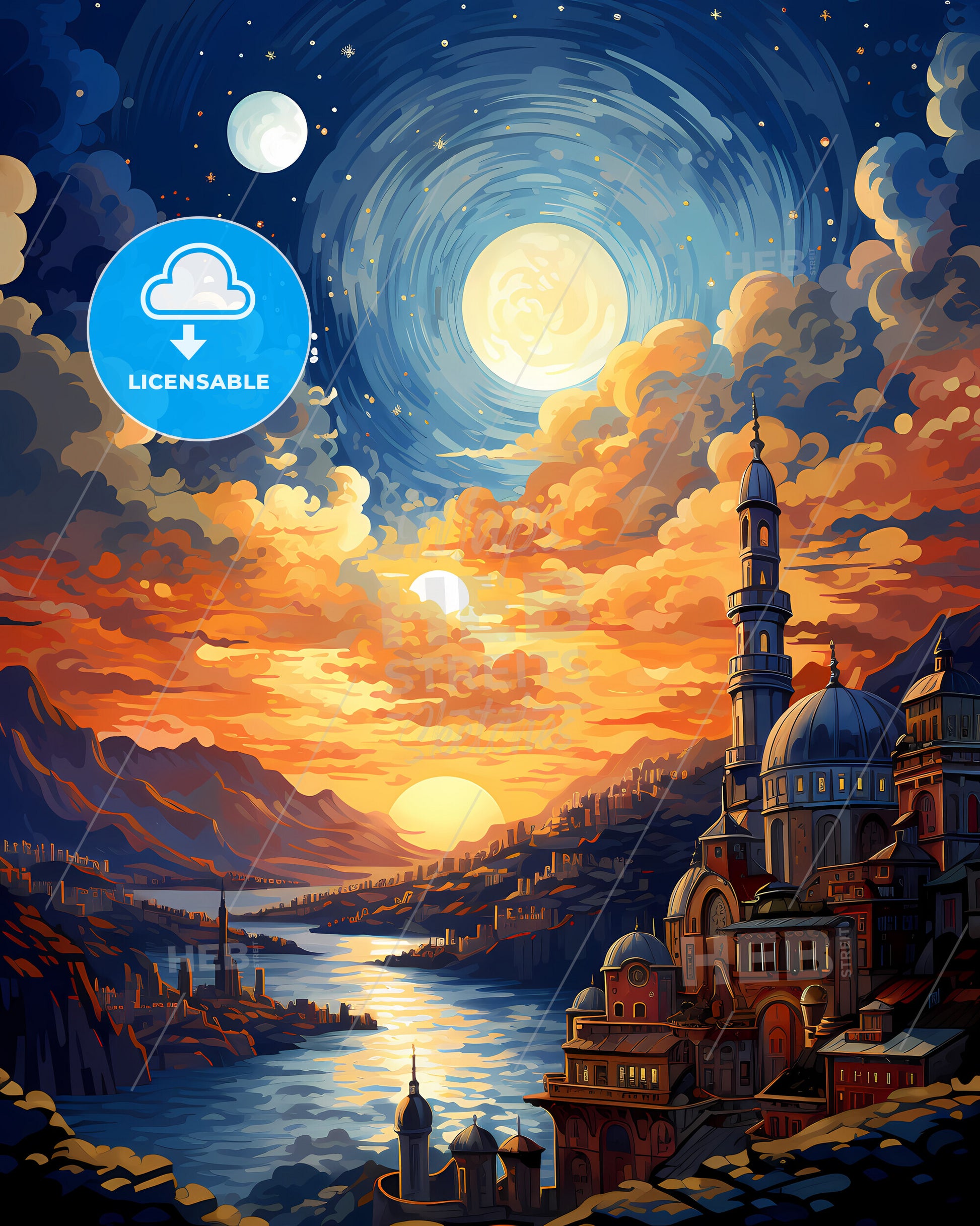 Istanbul, Turkey, Skyline. art painting with blue sky some bright clouds in spring. in style of classic advertising illustration with nice gradients. Nice strokes and outlines that captures the playful spirit and vivid imagination of modern art.