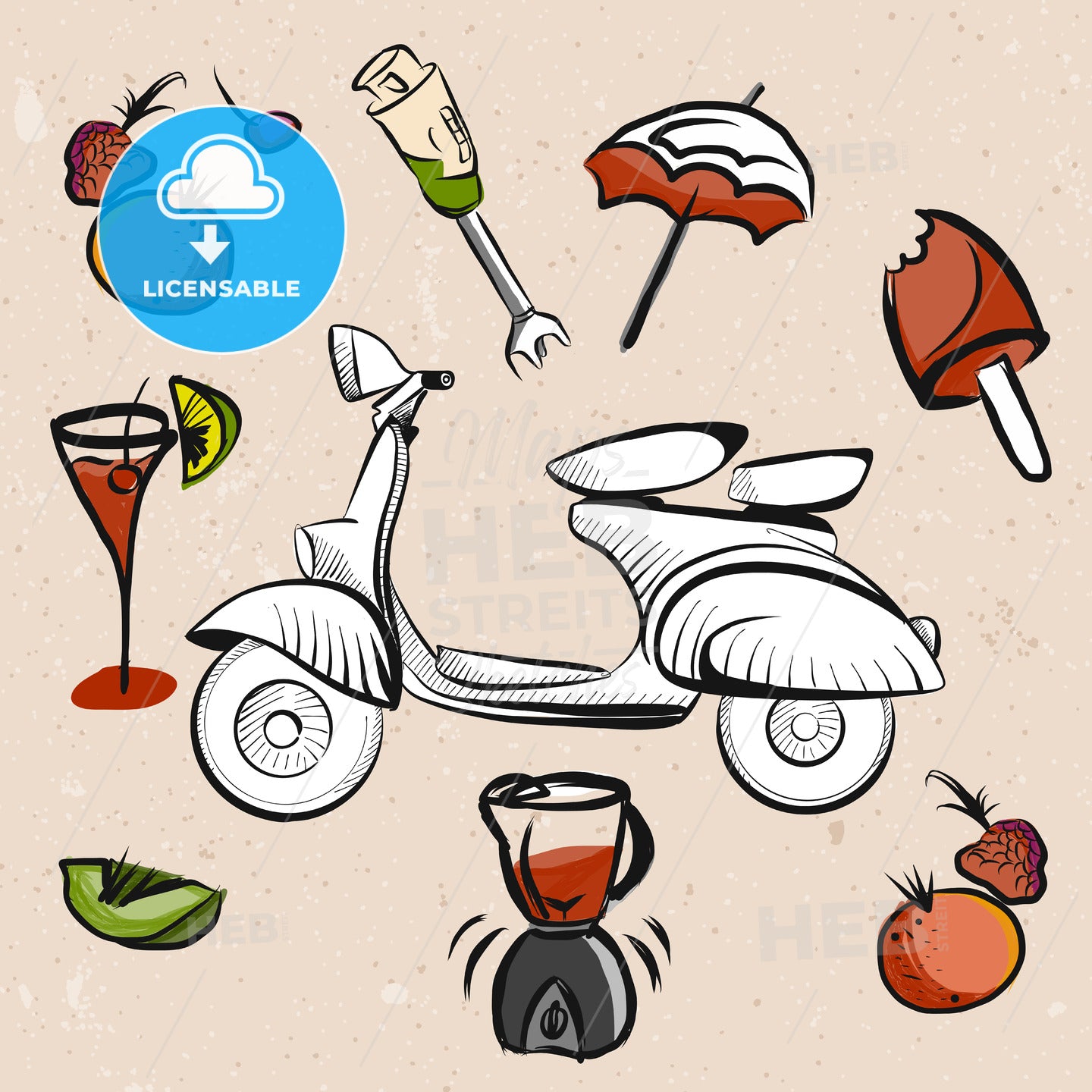 Italian Scooter, Fruits and Smoothie Signs, Hand Drawn Vector Artwork