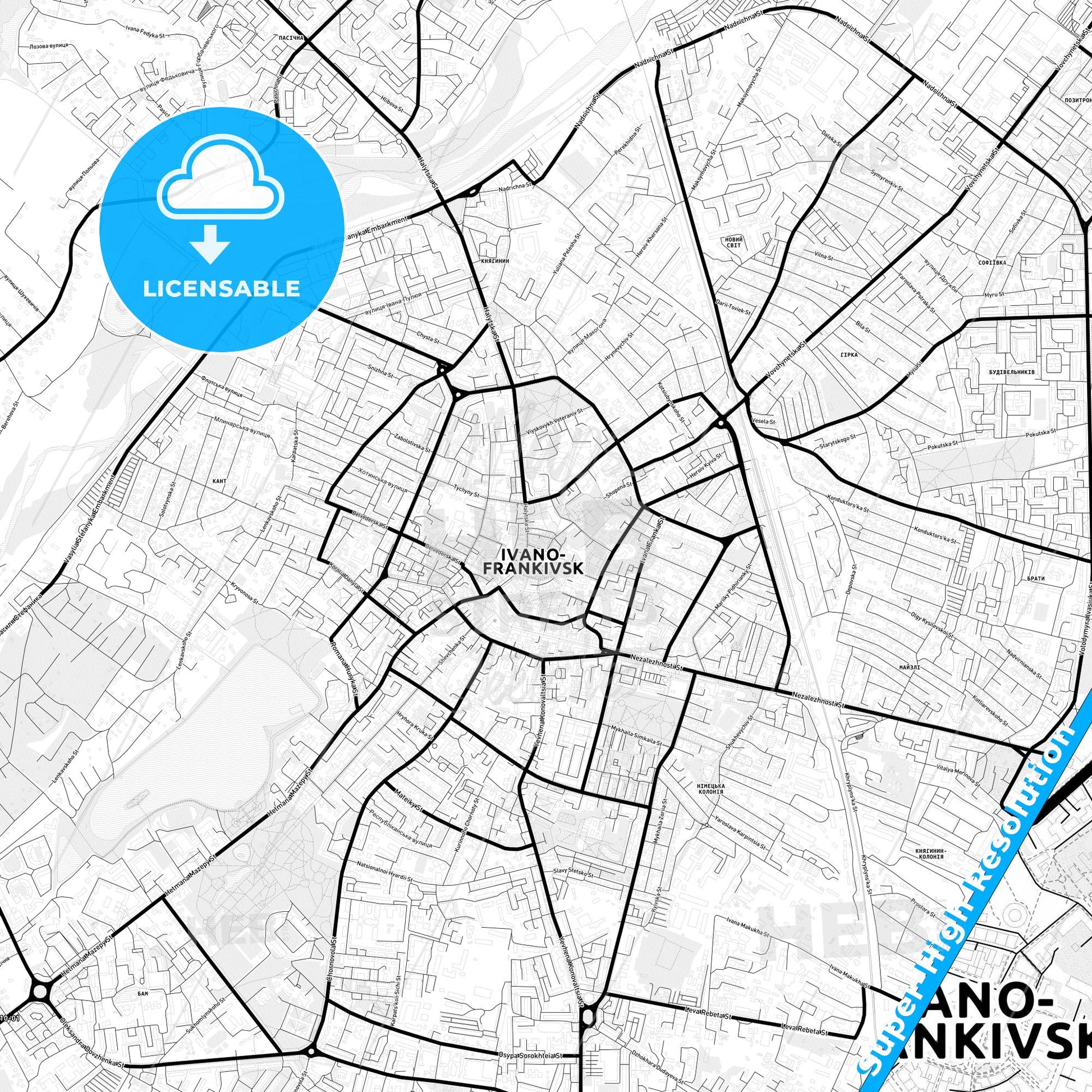 Ivano-Frankivsk, Ivano-Frankivsk Oblast, Ukraine in high-resolution, minimalist map designed for printed use. This detailed black and white map accurately highlights the street network and urban layout, making it an ideal ready-to-use map for your business.
