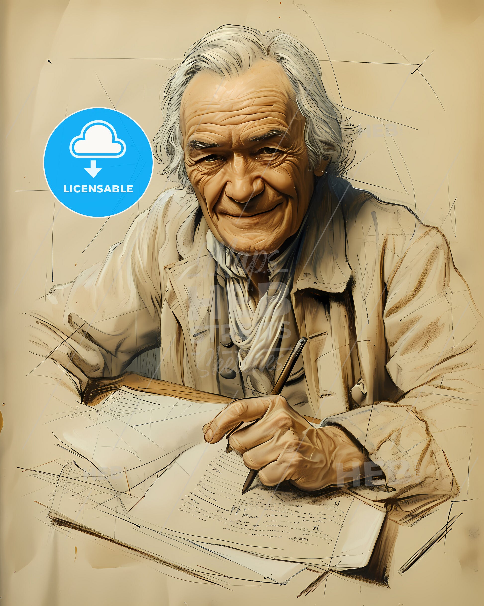 Portrait of James Boswell, 1740 - 1795, Biographer and Lawyer, Scottish biographer, best known for his biography of Samuel Johnson, "Life of Johnson." smiling. Vintage art illustration on bright beige paper background, sweeping overdrawn lines, subtile colored artwork, that captures the playful spirit and vivid imagination of modern art.